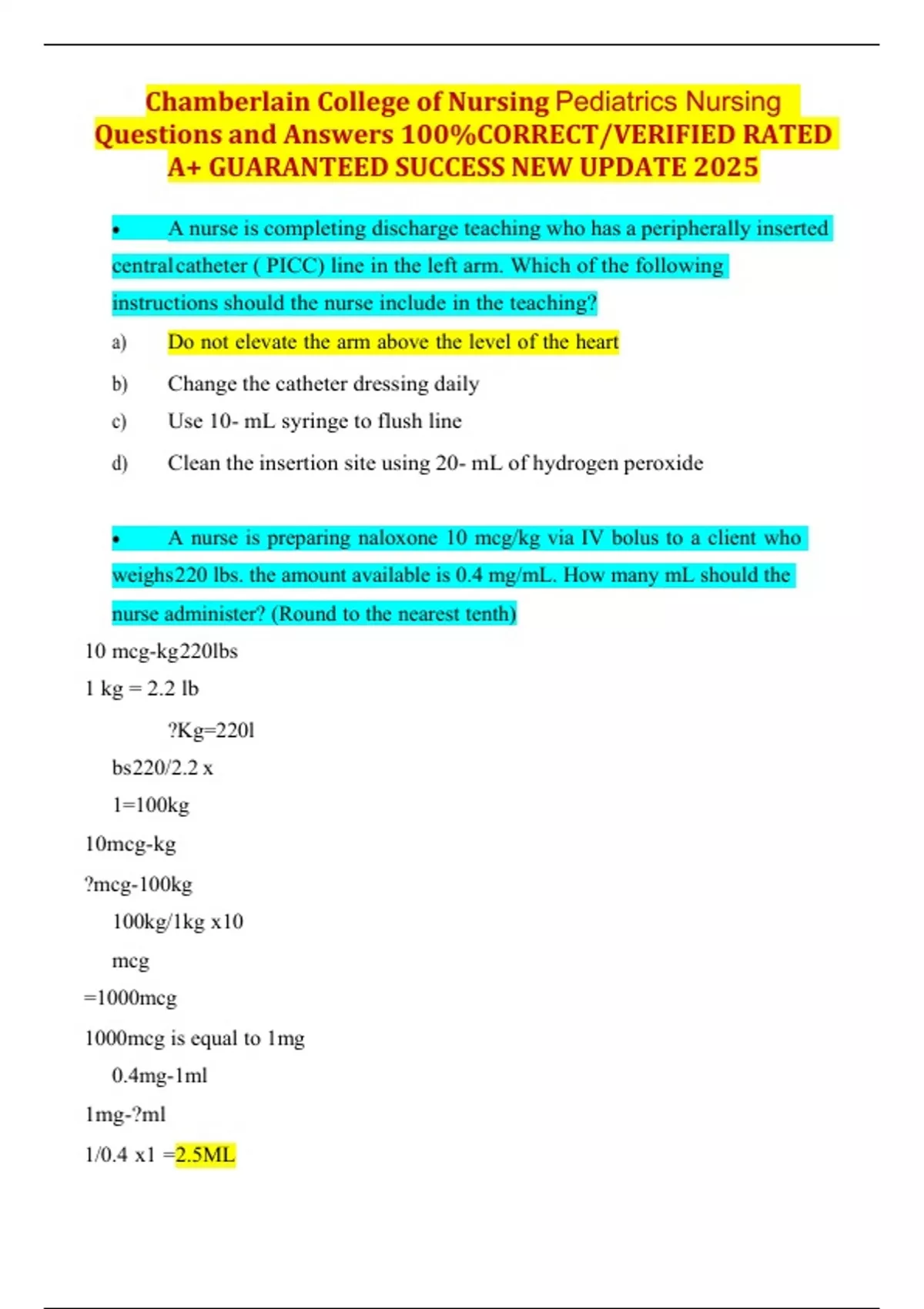 A nurse is preparing naloxone 10 mcg/kg via IV bolus to a client who