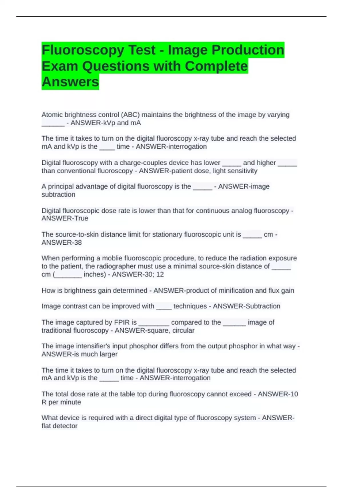 Fluoroscopy Test - Image Production Exam Questions with Complete Answers