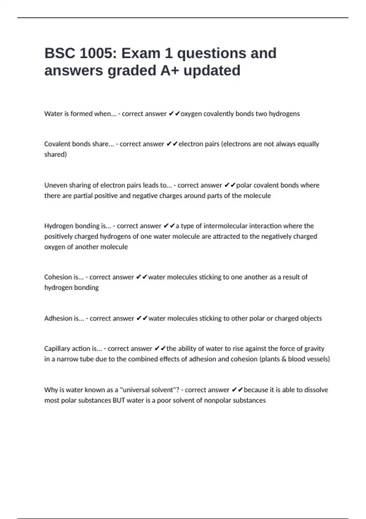 Water is formed when... - correct answer ✔✔oxygen covalently bonds two hydrogens