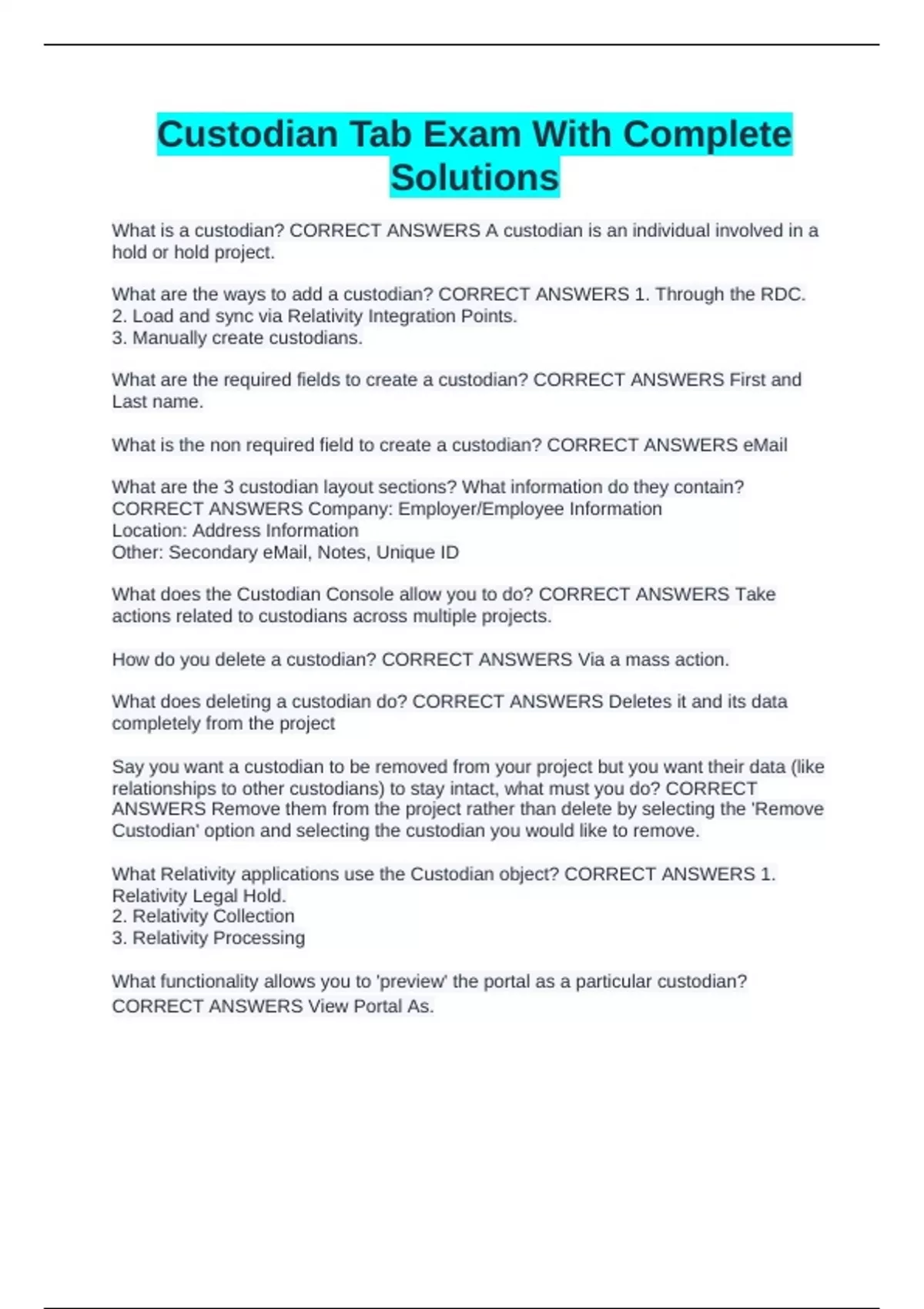 What does deleting a custodian do? CORRECT ANSWERS Deletes it and its data