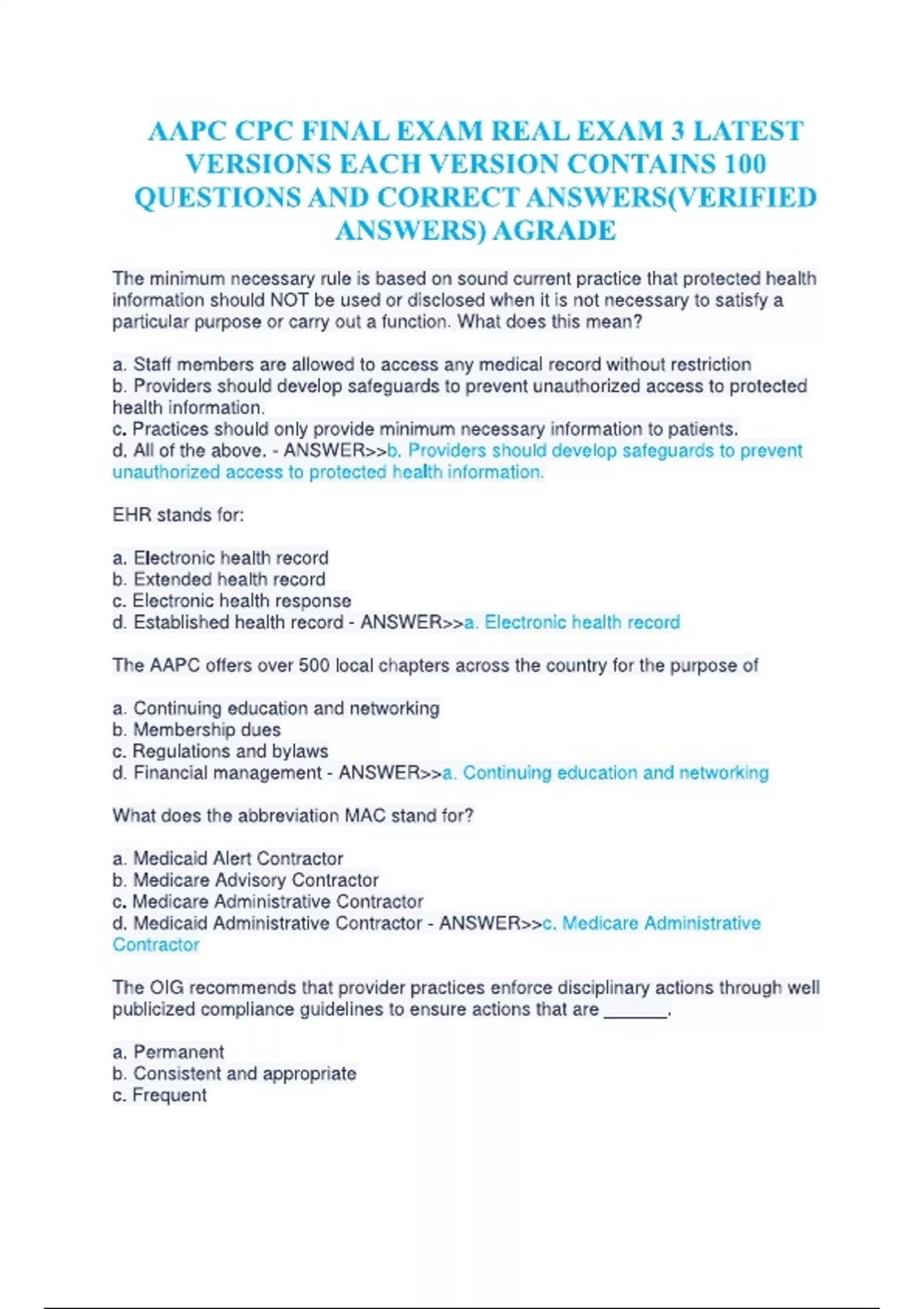 AAPC CPC Final EXAM REAL EXAM 3 Latest Versions EACH Version Contains 100 Questions and Answers latest update 100% Correct.