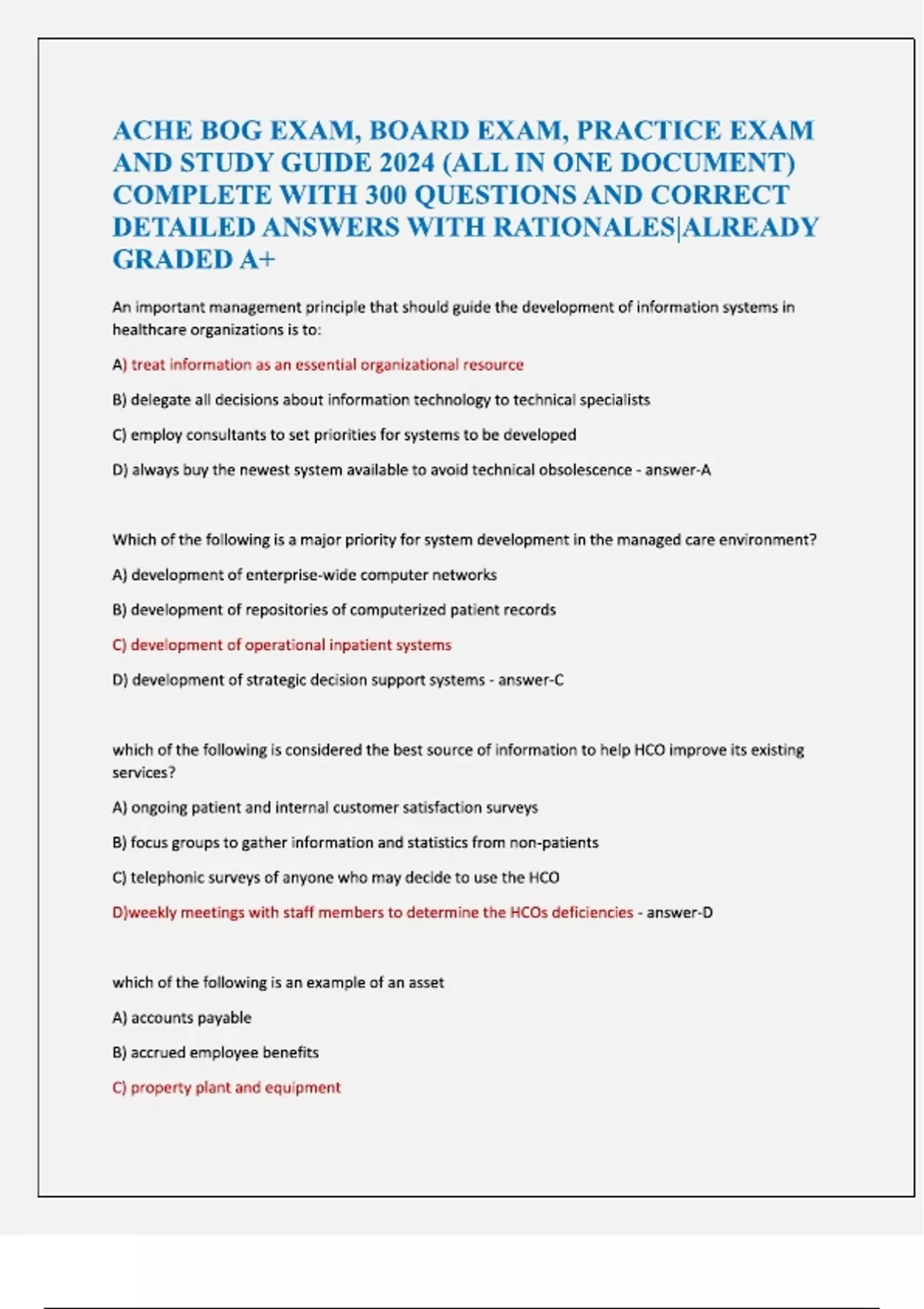 ACHE BOG EXAM, BOARD EXAM, PRACTICE EXAM AND STUDY GUIDE QUESTIONS WITH CORRECT ANSWERS LATEST UPDATE (100% VERIFIED) GRADE A+.