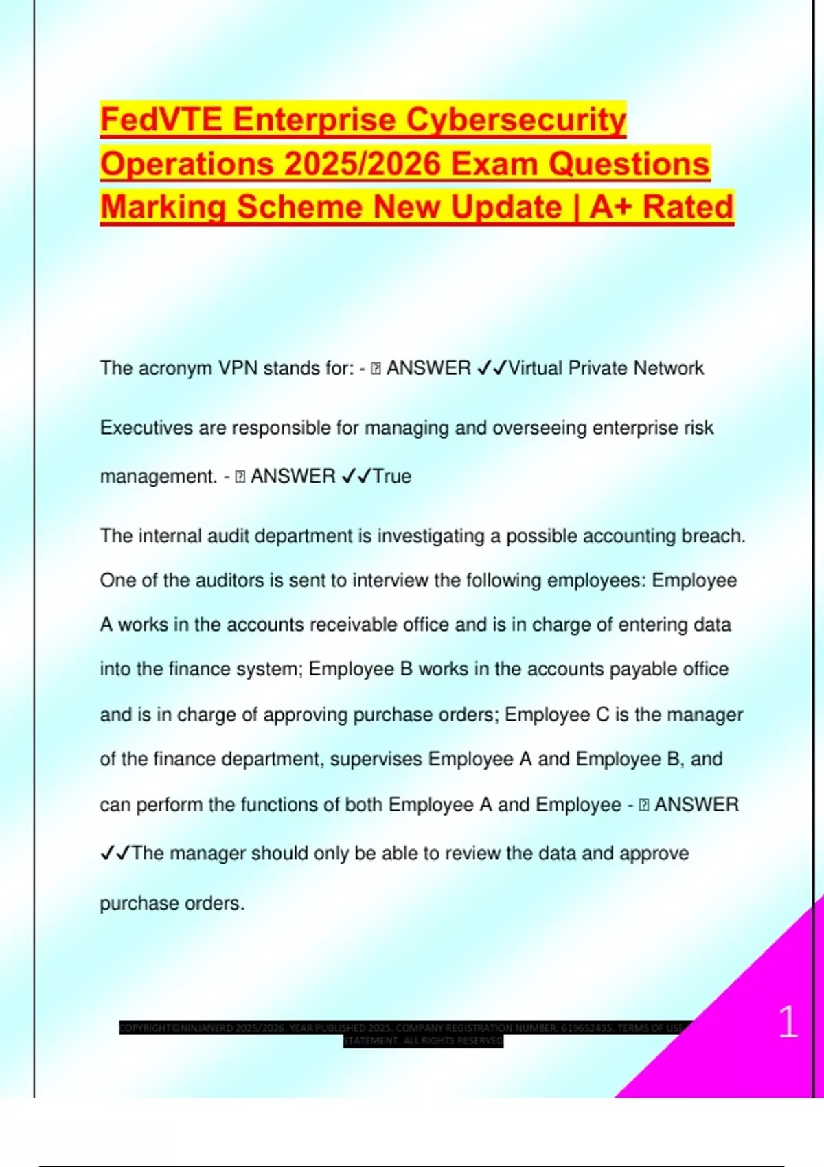 FedVTE Enterprise Cybersecurity Operations 2025/2026 Exam Questions Marking Scheme New Update | A+ Rated