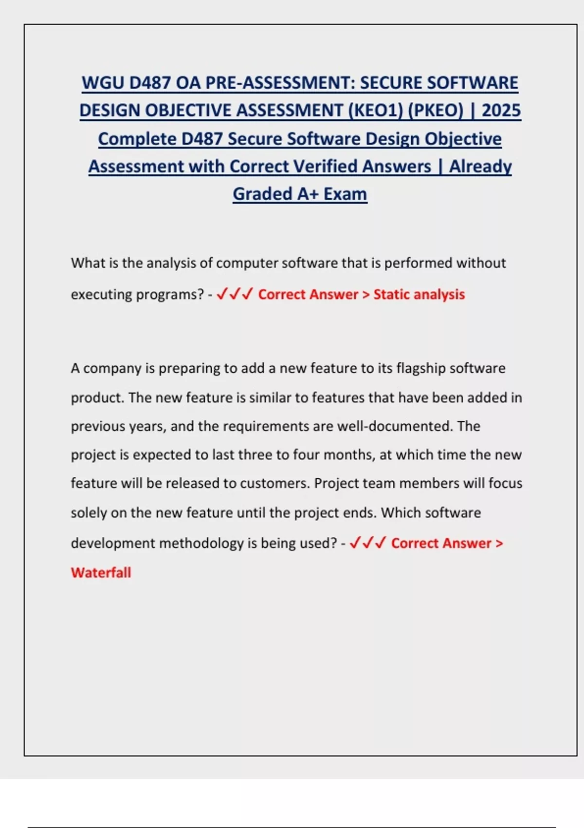 WGU D487 OA PRE-ASSESSMENT: SECURE SOFTWARE DESIGN OBJECTIVE ASSESSMENT (KEO1) (PKEO) | 2025 Complete D487 Secure Software Design Objective Assessment with Correct Verified Answers | Already Graded A+ ExamWGU D487 OA PRE-ASSESSMENT: SECURE SOFTWARE DESIGN OBJECTIVE ASSESSMENT (KEO1) (PKEO) | 2025 Complete D487 Secure Software Design Objective Assessment with Correct Verified Answers | Already Graded A+ ExamWGU D487 OA PRE-ASSESSMENT: SECURE SOFTWARE DESIGN OBJECTIVE ASSESSMENT (KEO1) (PKEO) | 2025 Complete D487 Secure Software Design Objective Assessment with Correct Verified Answers | Already Graded A+ ExamWGU D487 OA PRE-ASSESSMENT: SECURE SOFTWARE DESIGN OBJECTIVE ASSESSMENT (KEO1) (PKEO) | 2025 Complete D487 Secure Software Design Objective Assessment with Correct Verified Answers | Already Graded A+ ExamWGU D487 OA PRE-ASSESSMENT: SECURE SOFTWARE DESIGN OBJECTIVE ASSESSMENT (KEO1) (PKEO) | 2025 Complete D487 Secure Software Design Objective Assessment with Correct Verified Answers | Already Graded A+ ExamWGU D487 OA PRE-ASSESSMENT: SECURE SOFTWARE DESIGN OBJECTIVE ASSESSMENT (KEO1) (PKEO) | 2025 Complete D487 Secure Software Design Objective Assessment with Correct Verified Answers | Already Graded A+ ExamWGU D487 OA PRE-ASSESSMENT: SECURE SOFTWARE DESIGN OBJECTIVE ASSESSMENT (KEO1) (PKEO) | 2025 Complete D487 Secure Software Design Objective Assessment with Correct Verified Answers | Already Graded A+ ExamWGU D487 OA PRE-ASSESSMENT: SECURE SOFTWARE DESIGN OBJECTIVE ASSESSMENT (KEO1) (PKEO) | 2025 Complete D487 Secure Software Design Objective Assessment with Correct Verified Answers | Already Graded A+ ExamWGU D487 OA PRE-ASSESSMENT: SECURE SOFTWARE DESIGN OBJECTIVE ASSESSMENT (KEO1) (PKEO) | 2025 Complete D487 Secure Software Design Objective Assessment with Correct Verified Answers | Already Graded A+ ExamWGU D487 OA PRE-ASSESSMENT: SECURE SOFTWARE DESIGN OBJECTIVE ASSESSMENT (KEO1) (PKEO) | 2025 Complete D487 Secure Software Design Objective Assessment with Correct Verified Answers | Already Graded A+ ExamWGU D487 OA PRE-ASSESSMENT: SECURE SOFTWARE DESIGN OBJECTIVE ASSESSMENT (KEO1) (PKEO) | 2025 Complete D487 Secure Software Design Objective Assessment with Correct Verified Answers | Already Graded A+ ExamWGU D487 OA PRE-ASSESSMENT: SECURE SOFTWARE DESIGN OBJECTIVE ASSESSMENT (KEO1) (PKEO) | 2025 Complete D487 Secure Software Design Objective Assessment with Correct Verified Answers | Already Graded A+ ExamWGU D487 OA PRE-ASSESSMENT: SECURE SOFTWARE DESIGN OBJECTIVE ASSESSMENT (KEO1) (PKEO) | 2025 Complete D487 Secure Software Design Objective Assessment with Correct Verified Answers | Already Graded A+ Exam