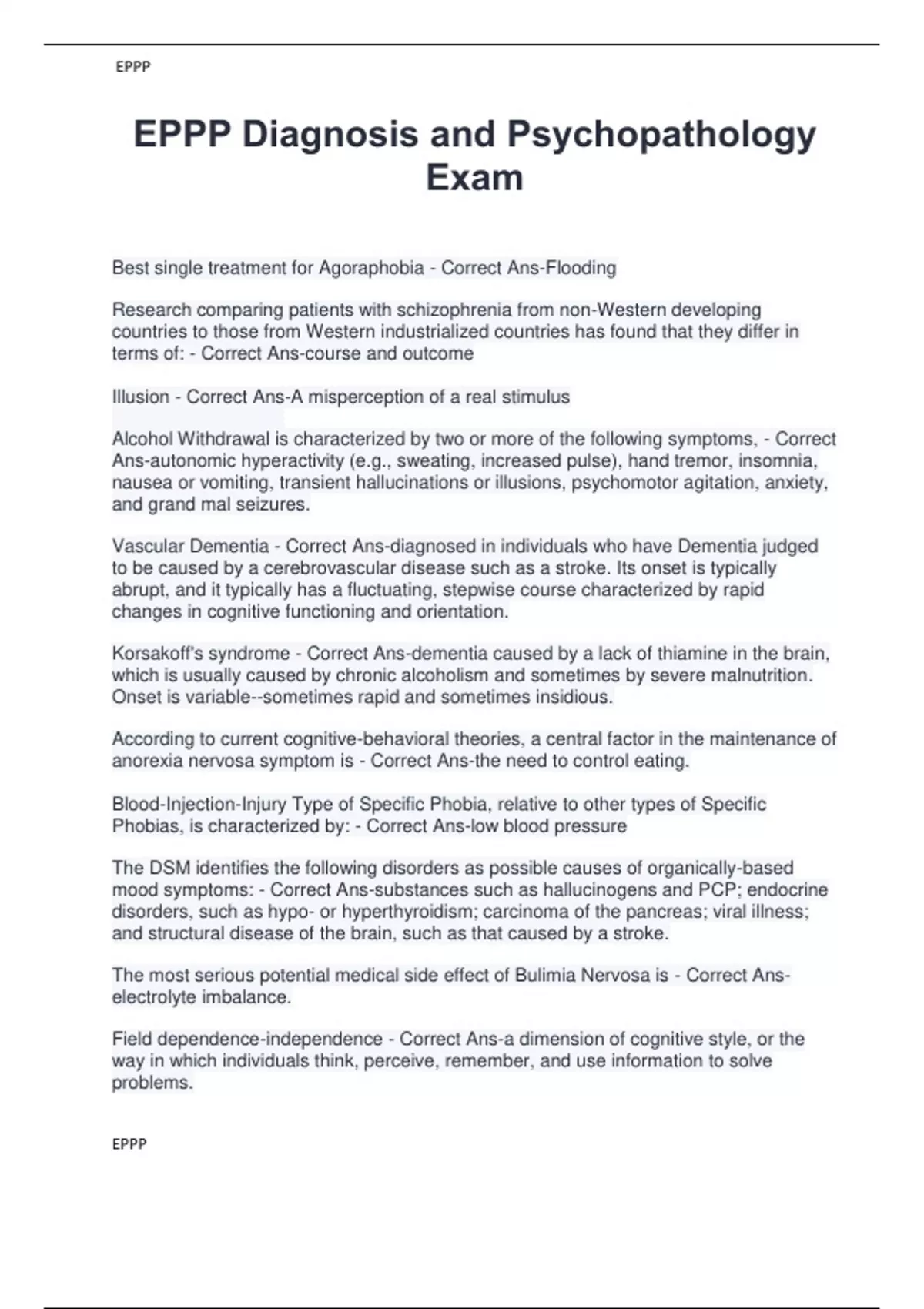 Best single treatment for Agoraphobia - Correct Ans-Flooding Research comparing patients with schizophrenia from non-Western developing countries to those from Western industrialized countries has found that they differ in terms of: - Correct Ans-course and outcome Illusion - Correct Ans-A misperception of a real stimulus Alcohol Withdrawal is characterized by two or more of the following symptoms, - Correct Ans-autonomic hyperactivity (e.g., sweating, increased pulse), hand tremor, insomnia, nausea or vomiting, transient hallucinations or illusions, psychomotor agitation, anxiety, and grand mal seizures. Vascular Dementia - Correct Ans-diagnosed in individuals who have Dementia judged to be caused by a cerebrovascular disease such as a stroke. Its onset is typically abrupt, and it typically has a fluctuating, stepwise course characterized by rapid changes in cognitive functioning and orientation. Korsakoff's syndrome - Correct Ans-dementia caused by a lack of thiamine in the brain, which is usually caused by chronic alcoholism and sometimes by severe malnutrition. Onset is variable--sometimes rapid and sometimes insidious. According to current cognitive-behavioral theories, a central factor in the maintenance of anorexia nervosa symptom is - Correct Ans-the need to control eating. Blood-Injection-Injury Type of Specific Phobia, relative to other types of Specific Phobias, is characterized by: - Correct Ans-low blood pressure The DSM identifies the following disorders as possible causes of organically-based mood symptoms: - Correct Ans-substances such as hallucinogens and PCP; endocrine disorders, such as hypo- or hyperthyroidism; carcinoma of the pancreas; viral illness; and structural disease of the brain, such as that caused by a stroke. The most serious potential medical side effect of Bulimia Nervosa is - Correct Ans electrolyte imbalance. Field dependence-independence - Correct Ans-a dimension of cognitive style, or the way in which individuals think, perceive, remember, and use information to solve problems. EPPP EPPP Research on psychosocial treatments for smoking cessation have provided the most support for the use of which of the following types of interventions? - Correct Ans behavioral. Avolition - Correct Ans-a lack of initiative, motivation or goal-directed activities and is considered a "negative" symptom of Schizophrenia or Schizophreniform disorder when it is severe enough to prevent an individual from doing basic activities. Alogia - Correct Ans-a lack of spontaneous speech Akathisia - Correct Ans-a movement disorder characterized by a feeling of restlessness, an inability to sit or keep still, a pressing need to be in constant motion and behaviors such as fidgeting, crossing and uncrossing the legs while sitting, rocking from foot to foot, marching in place and pacing characteristics linked to successful smoking cessation: - Correct Ans-being age 35 or older, married or living with a partner, later age when started smoking and being male Parasuicide - Correct Ans-intentional, non-fatal, serious, self-harming behaviors such as cutting or burning Sleep bruxism - Correct Ans-a person involuntarily grinds or clenches their teeth while sleeping, sometimes leading to wearing down the teeth and jaw discomfort. Treatment typically involves wearing a mouth guard during sleep. REM sleep behavior disorder - Correct Ans-a parasomnia that occurs later in the night than NREM disorders, usually affects middle-aged or elderly individuals, especially males, and sufferers often also have a neurological disorder. In this disorder, the temporary muscle paralysis that normally occurs during REM sleep does not occur so individuals may act out dreams through potentially violent movements or behaviors during sleep that can cause injuries to themselves or bed partners. Synesthesia - Correct Ans-a condition in which an involuntary joining of one sense is accompanied by a perception in another sense. For example, hearing is simultaneously perceived by an additional sense such as sight Hypokalemia - Correct Ans-deficient level of potassium in the blood Orientation is most frequently measured by which of the following scales? - Correct Ans-Galveston Orientation and Amnesia Test vegetative symptoms of depression - Correct Ans-persistent problems with appetite, weight loss or gain, sleep difficulties, reduced energy level, and changes in sexual desire or function. EPPP EPPP The brain areas most likely to be affected by FAS include: - Correct Ans-basal ganglia, hippocampus, and frontal lobes. Iatrogenic conditions are: - Correct Ans-adverse effects that result from treatment or intervention by a physician cataplexy - Correct Ans-a neurological condition that only occurs in people suffering from narcolepsy. It is characterized by a sudden loss of muscle tone and muscle weakness affecting both sides of the body. It is usually triggered by strong emotional experiences such as stress, anger, fear, and laughter. Electromyogram (EMG) biofeedback - Correct Ans-measures impulses in the muscles and indicates the degree of relaxation or contraction/tension. It is commonly used for conditions such as stress, tension headaches, chronic pain, muscle stiffness, incontinence, urinary urgency and frequency, and when muscles are healing. Electrodermal response (EDR) biofeedback - Correct Ans-also referred to as galvinic skin response training (GSR), measures skin surface changes, giving feedback on the relation between emotional state and the activity of the sympathetic system via sweat gland activity, and is utilized for stress and hyperhidrosis (excessive sweating). Research on the cognitive effects of chemotherapy and radiation on children with cancer indicate: - Correct Ans-younger children are at greater risk for more problems and more severe problems than are older children. Untreated diabetes mellitus can result in which of the following symptoms? - Correct Ans-increased appetite with weight loss, confusion, m