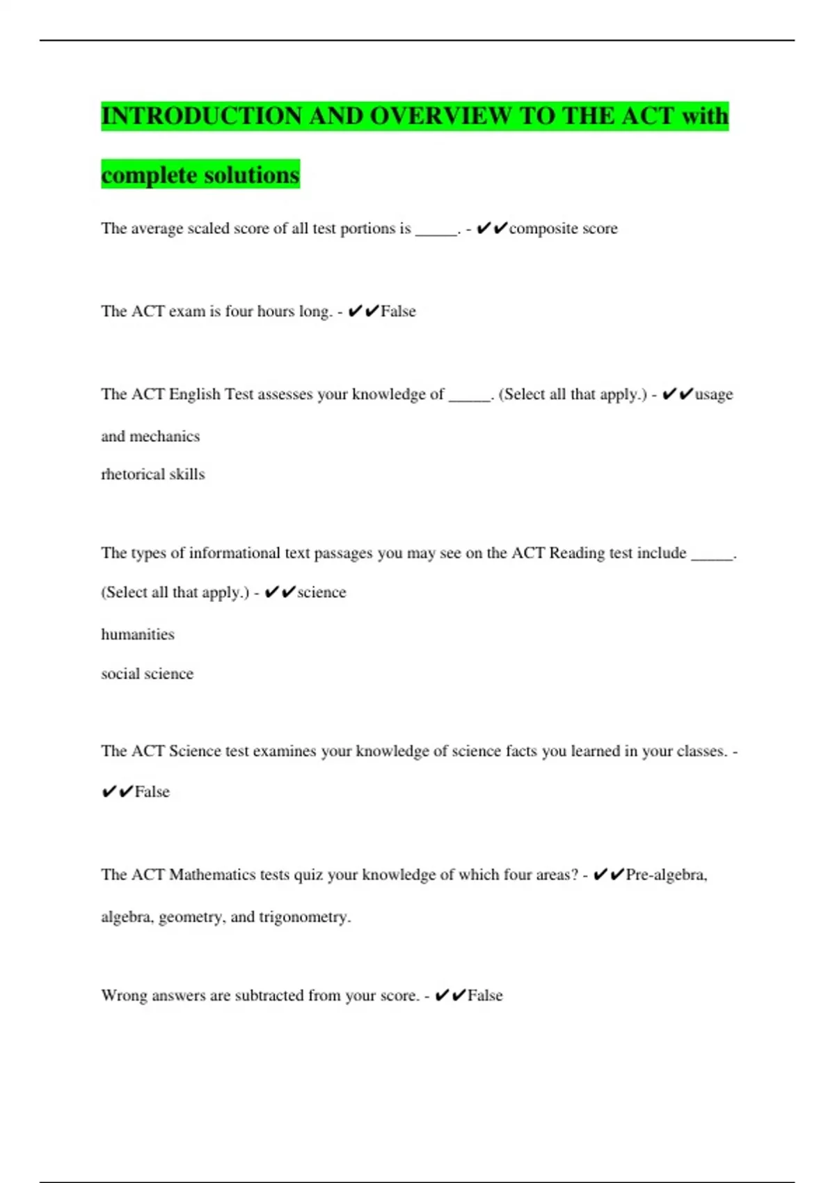 The ACT Mathematics tests quiz your knowledge of which four areas? - ✔✔Pre-algebra,