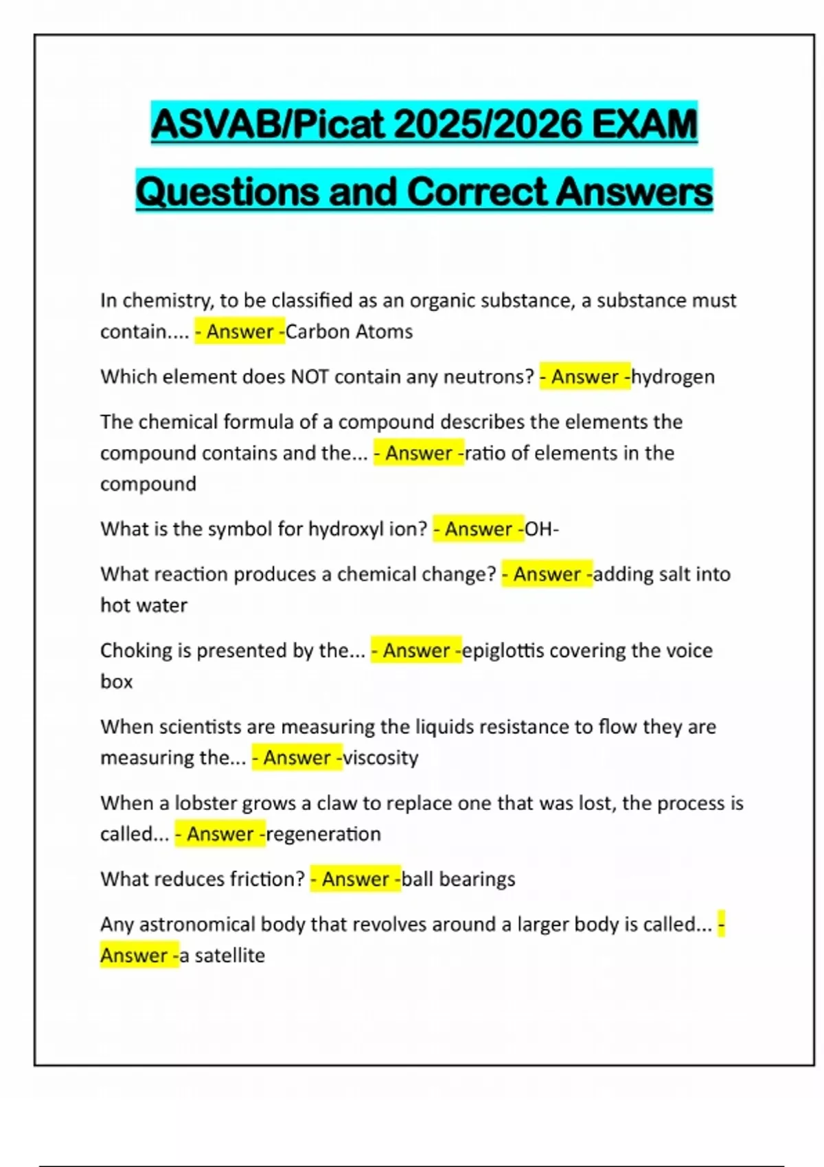 ASVAB/Picat 2025/2026 EXAM Questions and Correct Answers In chemistry, to be classified as an organic substance, a substance must contain.... - Answer -Carbon Atoms Which element does NOT contain any neutrons? - Answer -hydrogen The chemical formula of a compound describes the elements the compound contains and the... - Answer -ratio of elements in the compound What is the symbol for hydroxyl ion? - Answer -OHWhat reaction produces a chemical change? - Answer -adding salt into hot water Choking is presented by the... - Answer -epiglottis covering the voice box When scientists are measuring the liquids resistance to flow they are measuring the... - Answer -viscosity When a lobster grows a claw to replace one that