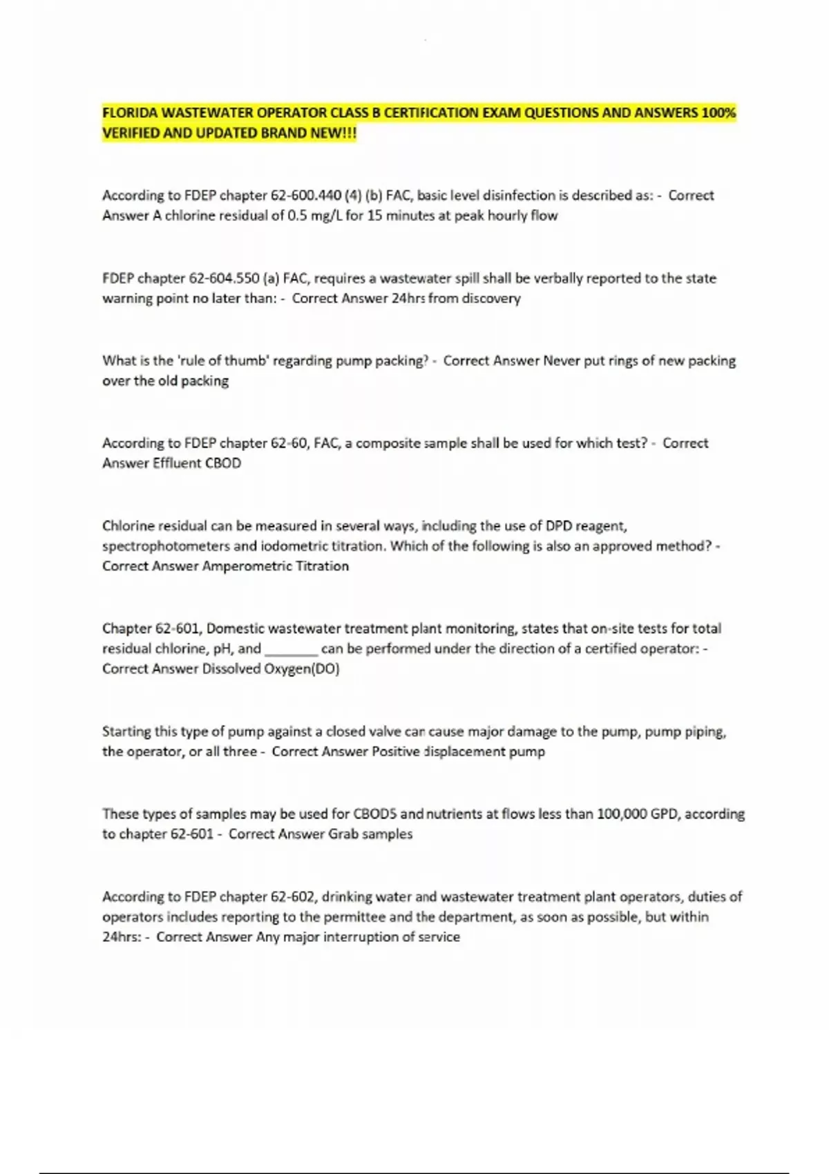 FLORIDA WASTEWATER OPERATOR CLASS B CERTIFICATION EXAM QUESTIONS AND ANSWERS 100% VERIFIED AND UPDATED BRAND NEW!!! According to FDEP chapter 62-600.440 (4) (b) FAC, basic level disinfection is described as: - Correct Answer A chlorine residual of 0.5 mg/L for 15 minutes at peak hourly flow FDEP chapter 62-604.550 (a) FAC, requires a wastewater spill shall be verbally reported to the state warning point no later than: - Correct Answer 24hrs from discovery What is the 'rule of thumb' regarding pump packing? - Correct Answer Never put rings of new packing over the old packing According to FDEP chapter 62-60, FAC, a composite sample shall be used for which test? - Correct Answer Effluent CBOD Chlorine residual can be measured in several ways, including the use of DPD reagent, spectrophotometers and iodometric titration. Which of the following is also an approved method? - Correct Answer Amperometric Titration Chapter 62-601, Domestic wastewater treatment plant monitoring, states that on-site tests for total