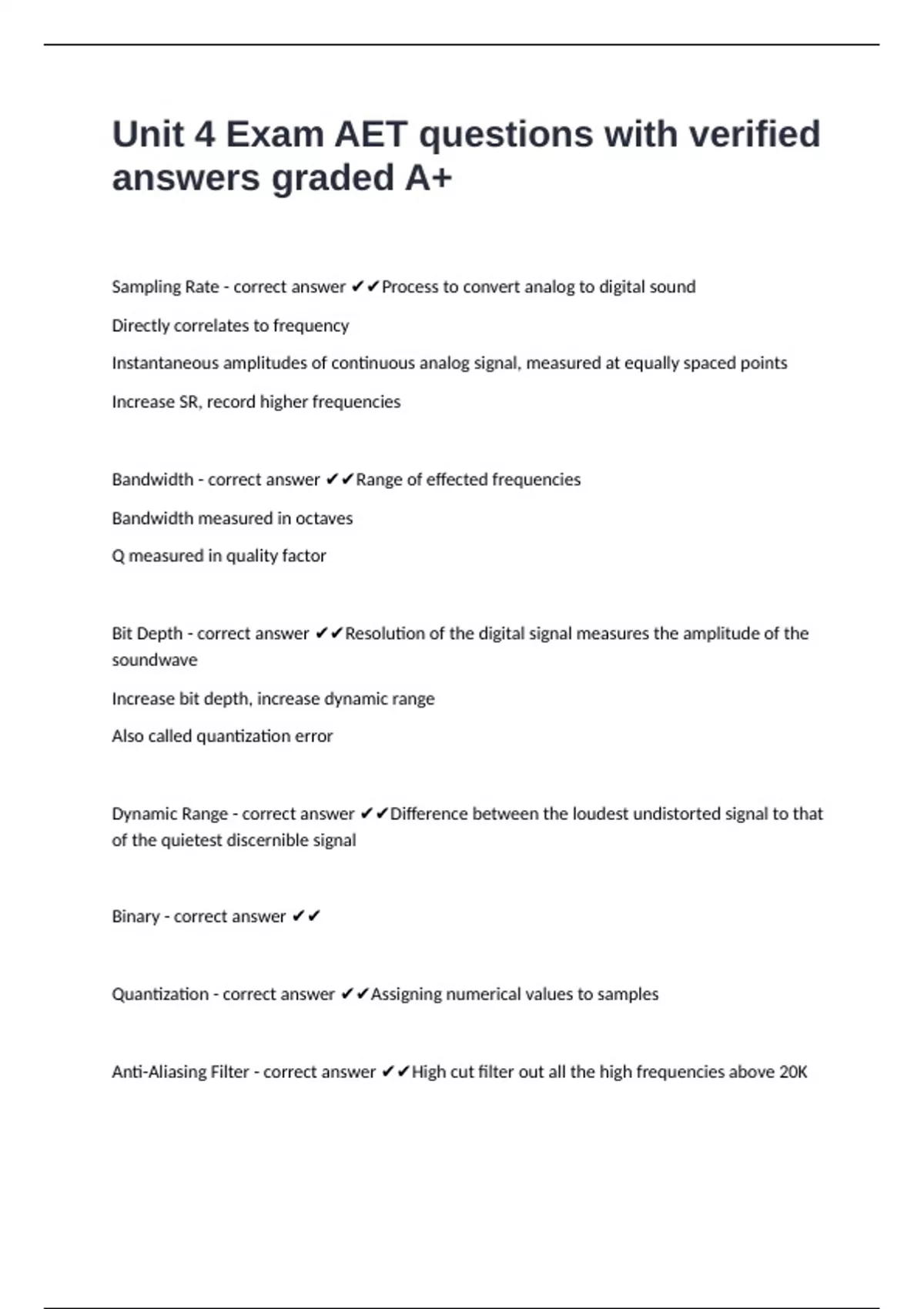 Sampling Rate - correct answer ✔✔Process to convert analog to digital sound