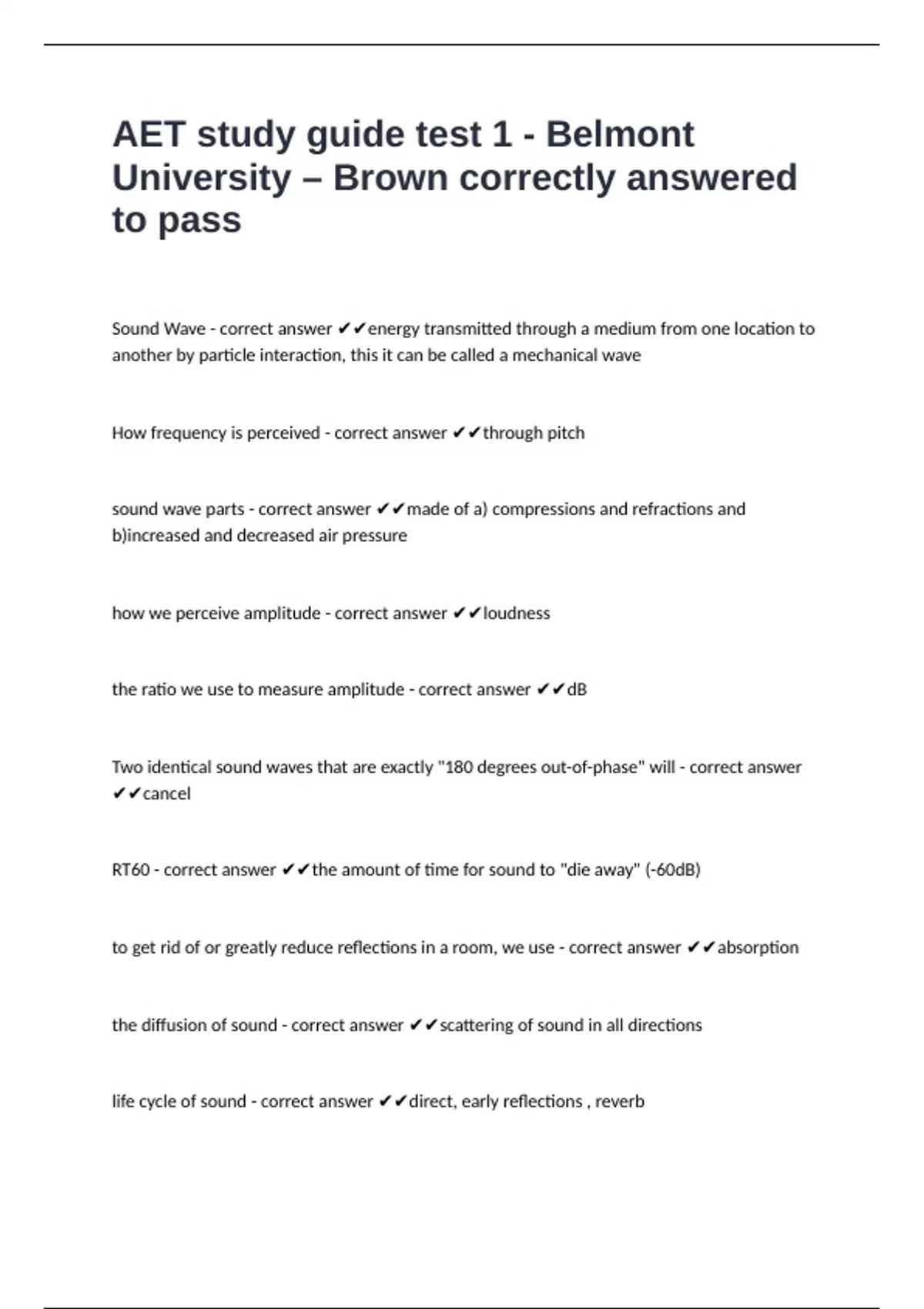RT60 - correct answer ✔✔the amount of time for sound to "die away" (-60dB)