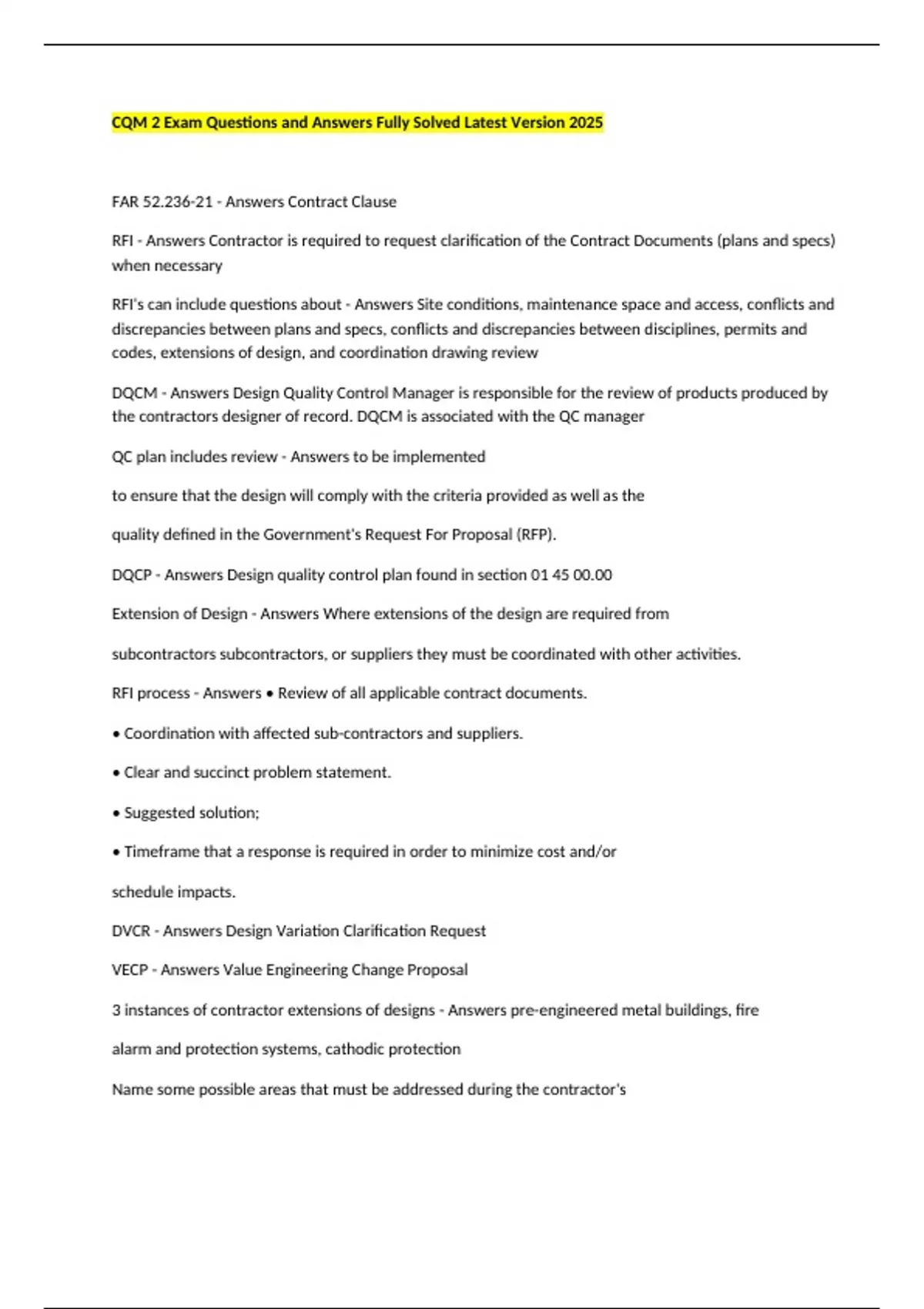 CQM 2 Exam Questions and Answers Fully Solved Latest Version 2025 FAR 52.236-21 - Answers Contract Clause RFI - Answers Contractor is required to request clarification of the Contract Documents (plans and specs) when necessary RFI's can include questions about - Answers Site conditions, maintenance space and access, conflicts and discrepancies between plans and specs, conflicts and discrepancies between disciplines, permits and codes, extensions of design, and coordination drawing review DQCM - Answers Design Quality Control Manager is responsible for the review of products produced by the contractors designer of record. DQCM is associated with the QC manager QC plan includes review - Answers to be implemented to ensure that the design will comply with the criteria provided as well as the quality defined in the Government's Request For Proposal (RFP). DQCP - Answers Design quality control plan found in section 01 45 00.00 Extension of Design - Answers Where extensions of the design are required from subcontractors subcontractors, or suppliers they must be coordinated with other activities. RFI process - Answers • Review of all applicable contract documents. • Coordination with affected sub-contractors and suppliers. • Clear and succinct problem statement. • Suggested solution; • Timeframe that a response is required in order to minimize cost and/or schedule impacts. DVCR - Answers Design Variation Clarification Request