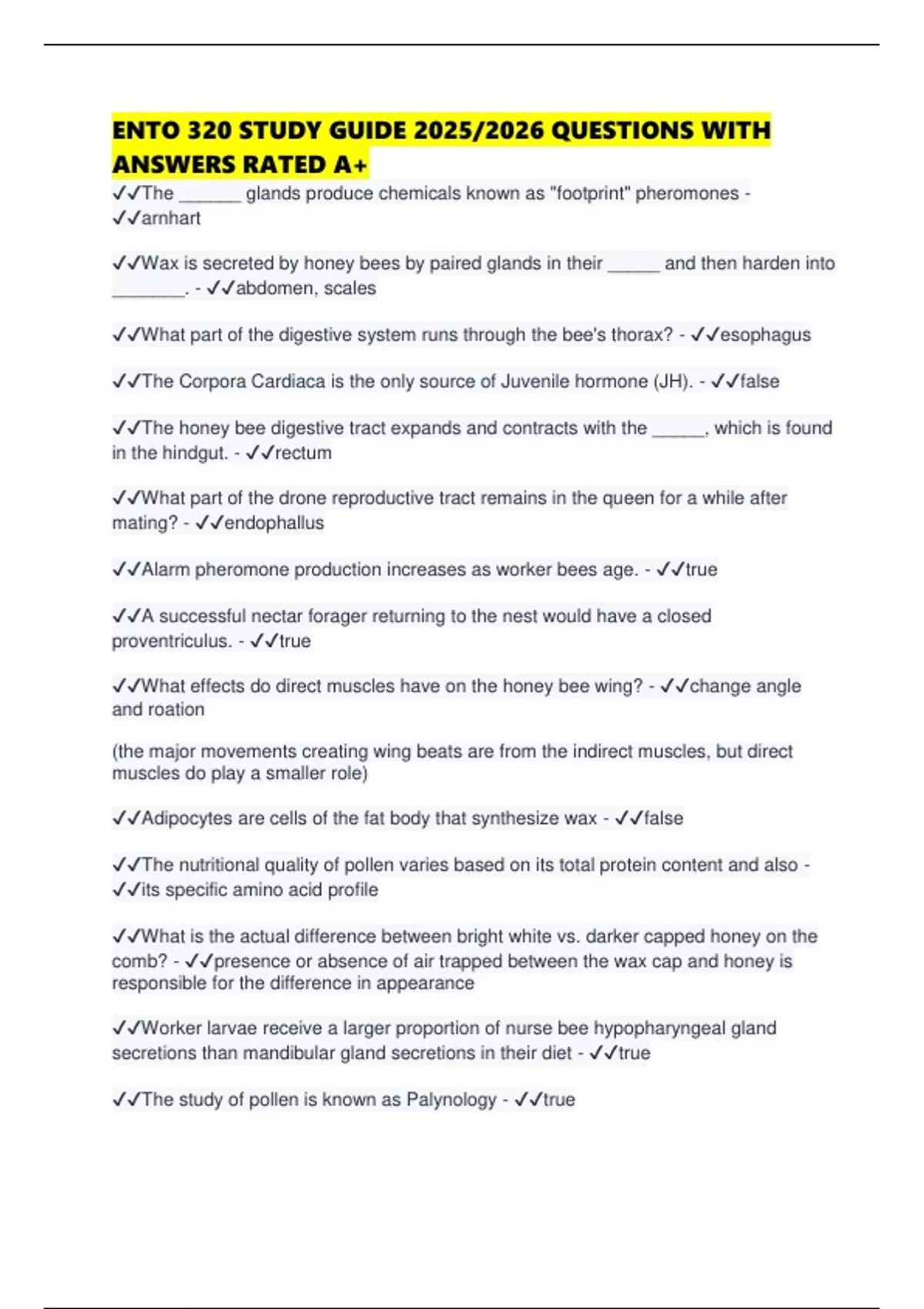 ENTO 320 STUDY GUIDE 2025/2026 QUESTIONS WITH ANSWERS RATED A+