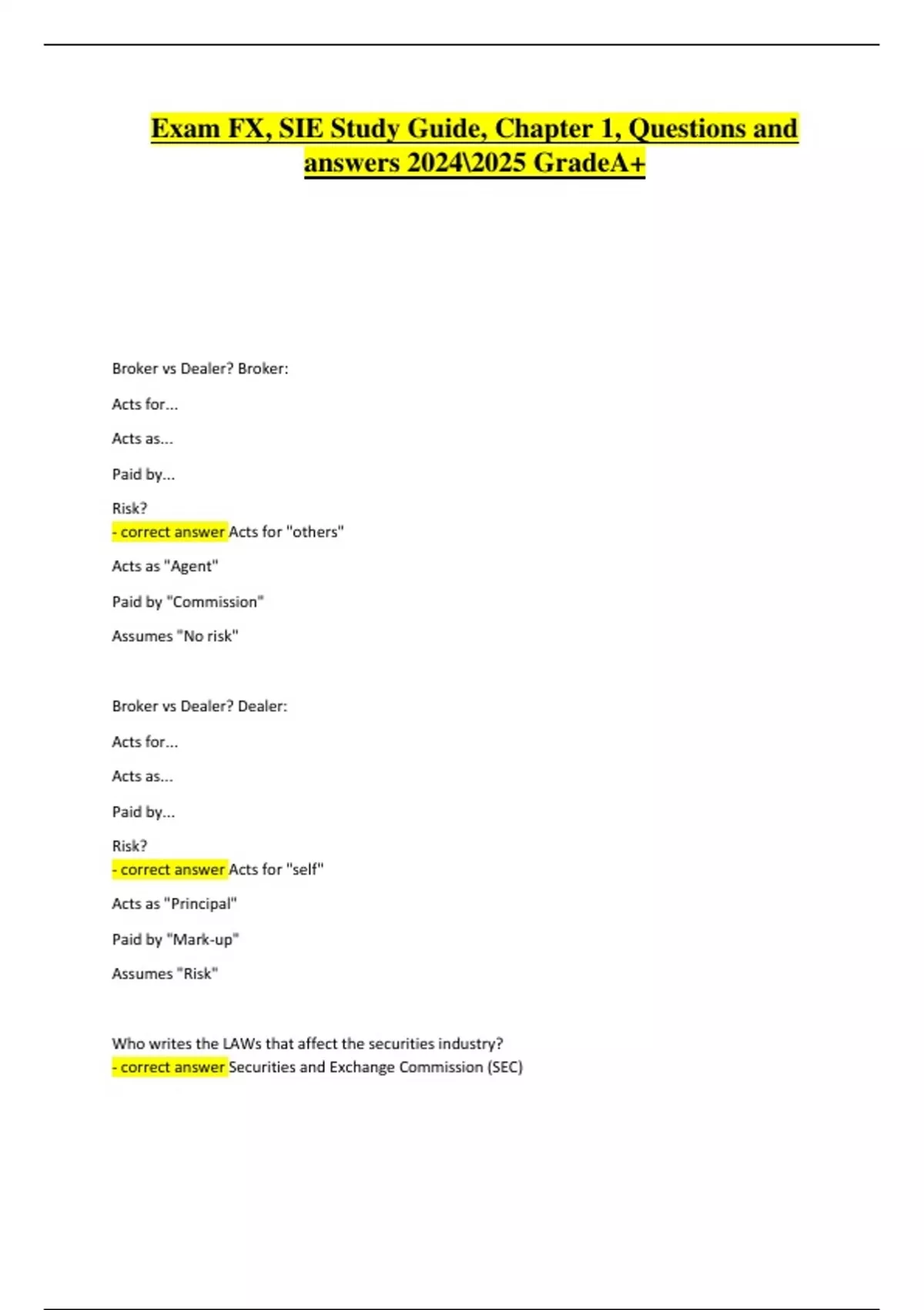 This document provides a complete set of questions and answers for Chapter 1 of the ExamFX Securities Industry Essentials (SIE) Study Guide. It covers foundational topics such as market structure, types of securities, regulatory agencies, and financial markets. Designed for clarity and accuracy, this resource supports effective study and exam preparation.