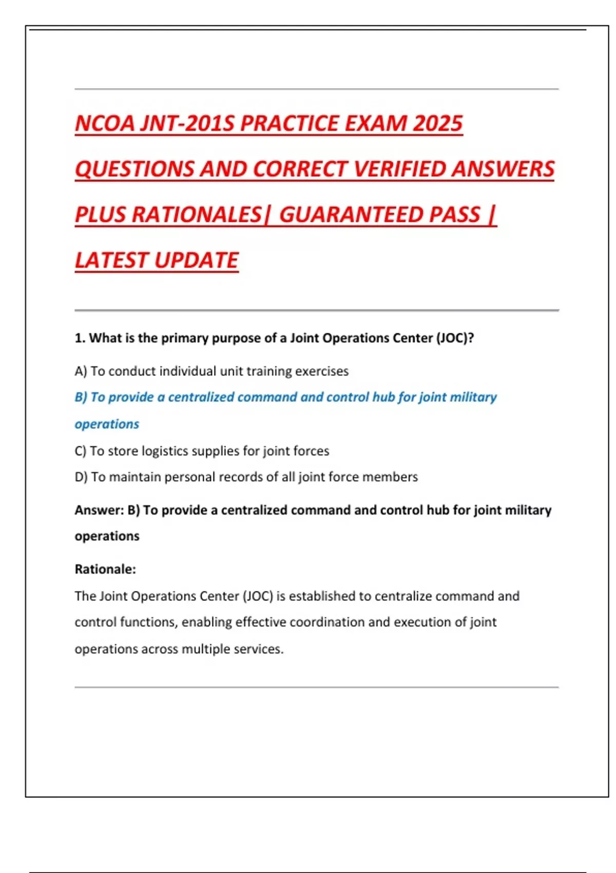 Answer: B) To provide a centralized command and control hub for joint military