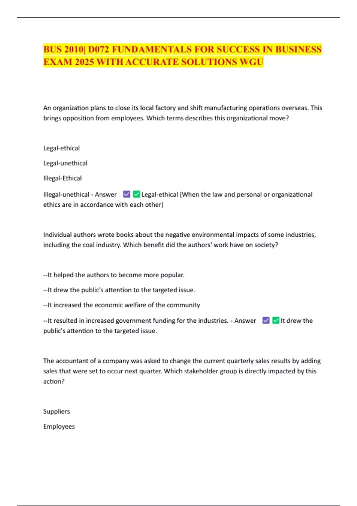 BUS 2010| D072 FUNDAMENTALS FOR SUCCESS IN BUSINESS EXAM 2025 WITH ACCURATE SOLUTIONS WGU