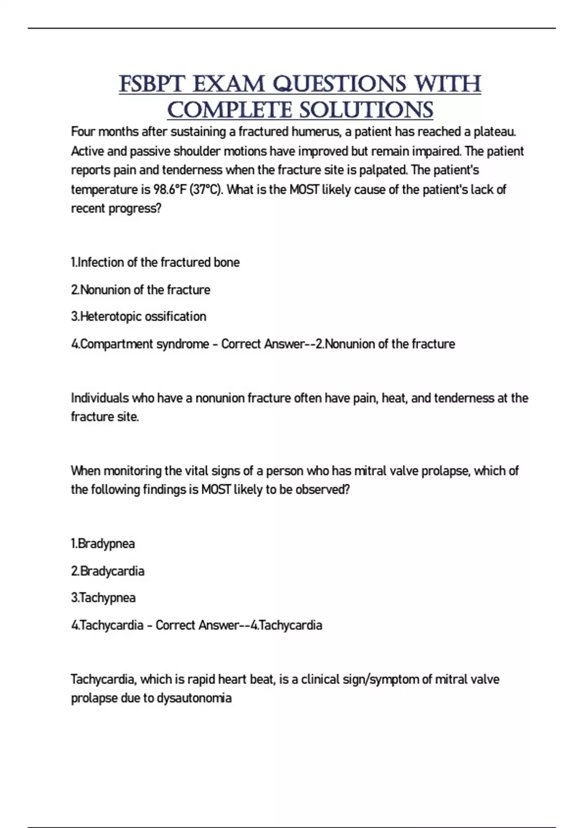 FSBPT Exam Questions With Complete Solutions Four months after sustaining a fractured humerus, a patient has reached a plateau. Active and passive shoulder motions have improved but remain impaired. The patient reports pain and tenderness when the fracture site is palpated. The patient's temperature is 98.6°F (37°C). What is the MOST likely cause of the patient's lack of recent progress? 1.Infection of the fractured bone 2.Nonunion of the fracture 3.Heterotopic ossification 4.Compartment syndrome - Correct Answer--2.Nonunion of the fracture Individuals who have a nonunion fracture often have pain, heat, and tenderness at the fracture site. When monitoring the vital signs of a person who has mitral valve prolapse, which of the following findings is MOST likely to be observed? 1.Bradypnea 2.Bradycardia 3.Tachypnea 4.Tachycardia - Correct Answer--4.Tachycardia Tachycardia, which is rapid heart beat, is a clinical sign/symptom of mitral valve prolapse due to dysautonomia The exercise shown in the photograph is LEAST appropriate for a patient who has which of the following characteristics? 1.Anterior glenohumeral instability 2.Forward head posture 3.Limited glenohumeral lateral (external) rotation range of motion 4.Tightness of the pectoralis minor and pectoralis major - Correct Answer--1.Anterior glenohumeral instability