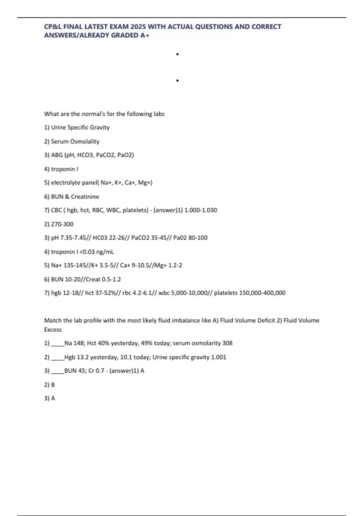 Match the lab profile with the most likely fluid imbalance like A) Fluid Volume Deficit 2) Fluid Volume