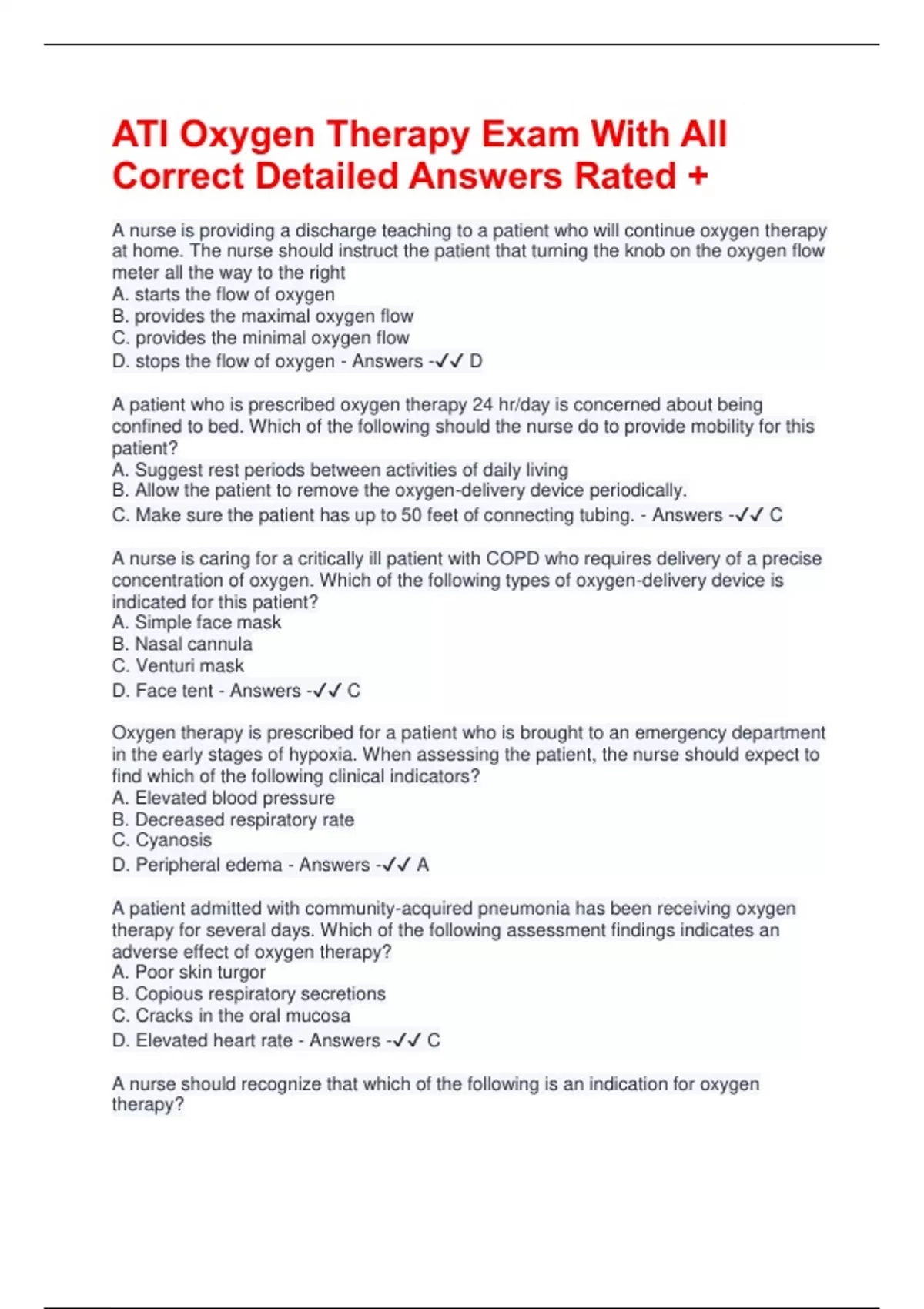 ATI Oxygen Therapy Exam With All Correct Detailed Answers Rated + A nurse is providing a discharge teaching to a patient who will continue oxygen therapy at home. The nurse should instruct the patient that turning the knob on the oxygen flow meter all the way to the right A. starts the flow of oxygen B. provides the maximal oxygen flow C. provides the minimal oxygen flow D. stops the flow of oxygen - Answers - D A patient who is prescribed oxygen therapy 24 hr/day is concerned about being confined to bed. Which of the following should the nurse do to provide mobility for this patient? A. Suggest rest periods between activities of daily living B. Allow the patient to remove the oxygen-delivery device periodically. C. Make sure the patient has up to 50 feet of connecting tubing. - Answers - C A nurse is caring for a critically ill patient with COPD who requires delivery of a precise concentration of oxygen. Which of the following types of oxygen-delivery device is indicated for this patient? A. Simple face mask B. Nasal cannula C. Venturi mask D. Face tent - Answers - C Oxygen therapy is prescribed for a patient who is brought to an emergency department in the early stages of hypoxia. When assessing the patient, the nurse should expect to find which of the following clinical indicators? A. Elevated blood pressure B. Decreased respiratory rate C. Cyanosis D. Peripheral edema - Answers - A A patient admitted with community-acquired pneumonia has been receiving oxygen therapy for several days. Which of the following assessment findings indicates an adverse effect of oxygen therapy? A. Poor skin turgor B. Copious respiratory secretions C. Cracks in the oral mucosa D. Elevated heart rate - Answers - C A nurse should recognize that which of the following is an indication for oxygen therapy? A. Respiratory rate 32/min; anxiety B. Dyspnea; PaO2 90 mm Hg C. Chest pain; FiO2 65% for 4 days D. Tachypnea; SaO2 90% - Answers - D