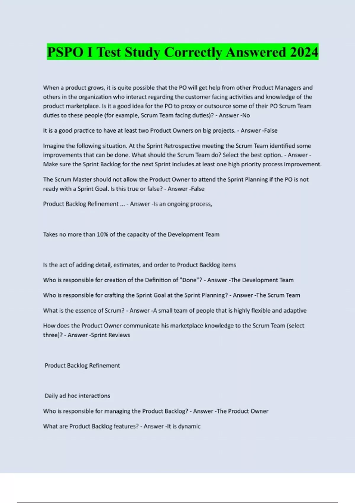 PSPO I Test Study Correctly Answered 2024 When a product grows, it is quite possible that the PO will get help from other Product Managers and others in the organization who interact regarding the customer facing activities and knowledge of the product marketplace. Is it a good idea for the PO to proxy or outsource some of their PO Scrum Team duties to these people (for example, Scrum Team facing duties)? - Answer -No It is a good practice to have at least two Product Owners on big projects. - Answer -False Imagine the following situation. At the Sprint Retrospective meeting the Scrum Team identified some improvements that can be done. What should the Scrum Team do? Select the best option. - Answer - Make sure the Sprint Backlog for the next Sprint includes at least one high priority process improvement. The Scrum Master should not allow the Product Owner to attend the Sprint Planning if the PO is not ready with a Sprint Goal. Is this true or false? - Answer -False Product Backlog Refinement ... - Answer -Is an ongoing process, Takes no more than 10% of the capacity of the Development Team Is the act of adding detail, estimates, and order to Product Backlog items Who is responsible for creation of the Definition of "Done"? - Answer -The Development Team Who is responsible for crafting the Sprint Goal at the Sprint Planning? - Answer -The Scrum Team What is the essence of Scrum? - Answer -A small team of people that is highly flexible and adaptive How does the Product Owner communicate his marketplace knowledge to the Scrum Team (select three)? - Answer -Sprint Reviews Product Backlog Refinement Daily ad hoc interactions Who is responsible for managing the Product Backlog? - Answer -The Product Owner What are Product Backlog features? - Answer -It is dynamicAs long as a product exists, its Product Backlog also exists It is never complete Where Scrum can be used? - Answer -Managing the operation of an organization Development of software and hardware Development and sustaining of Cloud and other operational environments Development of products and enhancements Research and identifying of viable markets, technologies, and product capabilities Development of almost everything we use in our daily lives as individuals and societies What provides guidance to the Development Team on why it is building the Increment? - Answer -The Sprint Goal All the Scrum Teams working on the same product should have the same Sprint length. - Answer -False What happens during the Sprint? - Answer -Quality goals do not decrease No changes are made that would endanger the Sprint Goal Scope may be clarified and re-negotiated between the Product Owner and Development Team as more is learned What are the three most applicable characteristics of the Product Owner? - Answer -Product Marketplace Expert Product Value Maximizer Lead Facilitator of Key Stakeholder Involvement What is the order of items in the Product Backlog? - Answer -Less valuable and most unclear items at the bottom