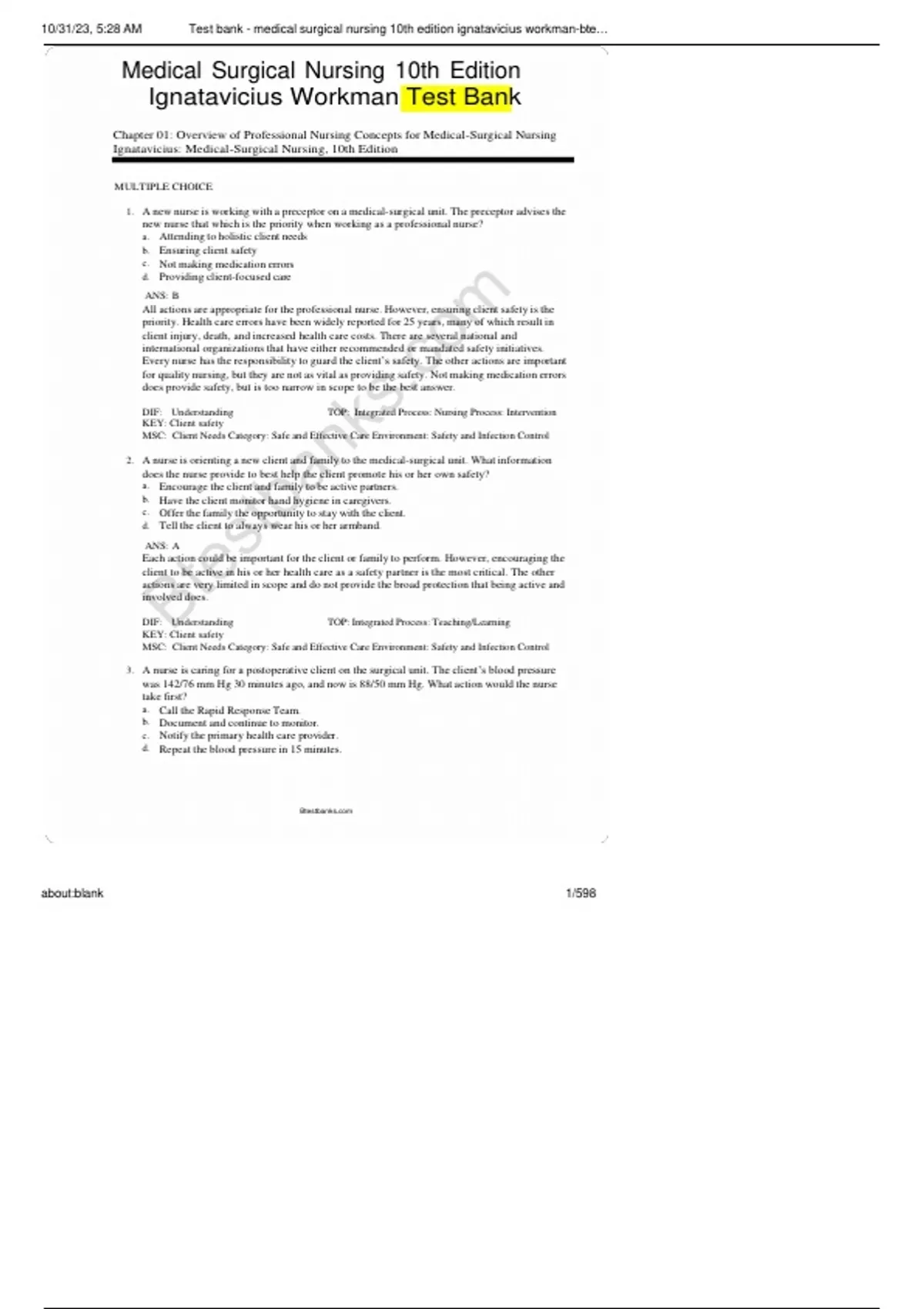 , 10/31/23, 5:28 AM Test bank - medical surgical nursing 10th edition ignatavicius workman-bte…