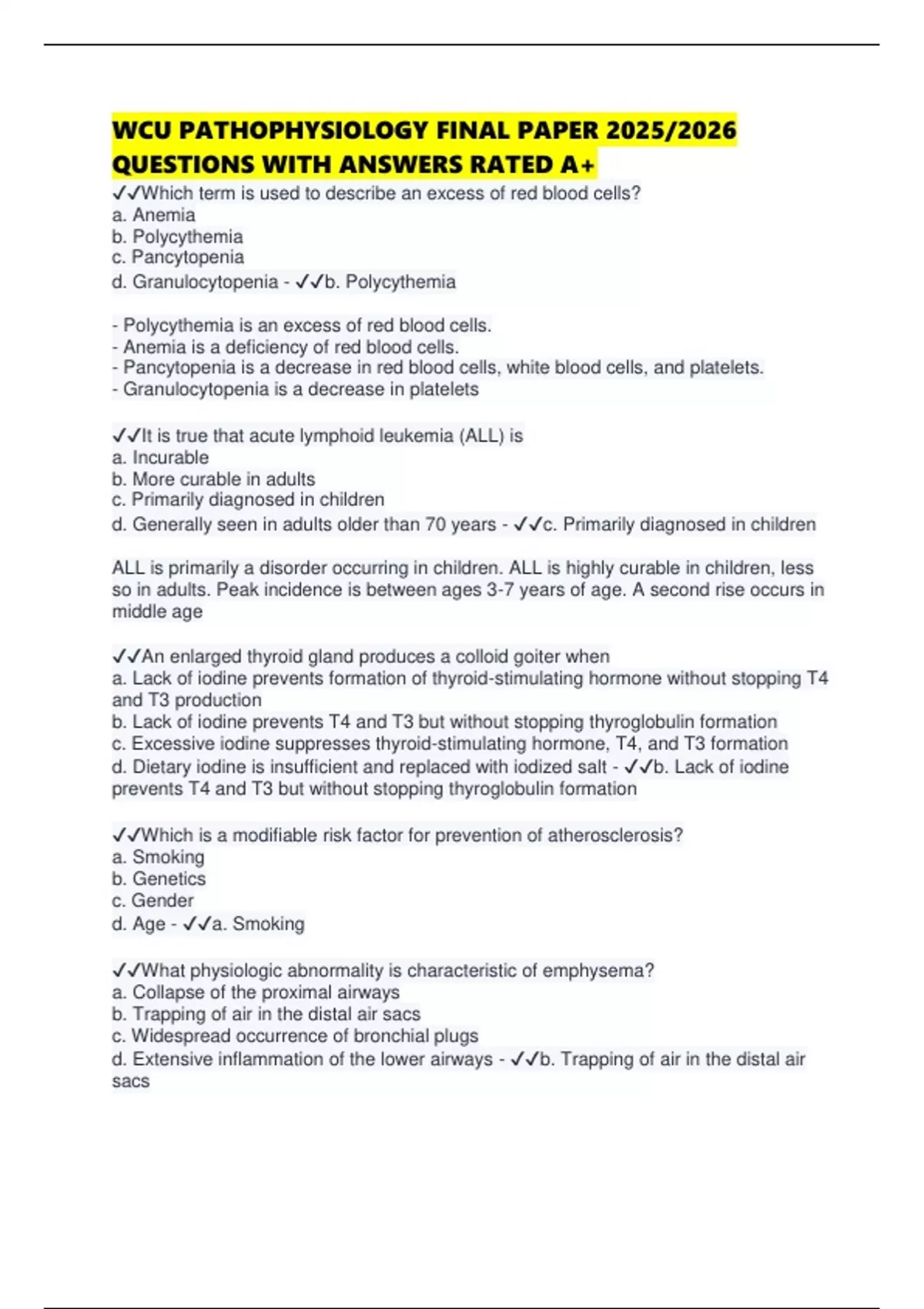 WCU PATHOPHYSIOLOGY FINAL PAPER 2025/2026 QUESTIONS WITH ANSWERS RATED A+