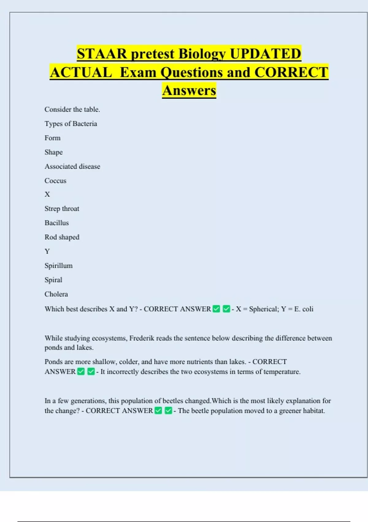 STAAR pretest Biology UPDATED ACTUAL Exam Questions and CORRECT Answers Consider the table. Types of Bacteria Form Shape Associated disease Coccus X Strep throat Bacillus Rod shaped Y Spirillum Spiral Cholera Which best describes X and Y? - CORRECT ANSWER - X = Spherical; Y = E. c