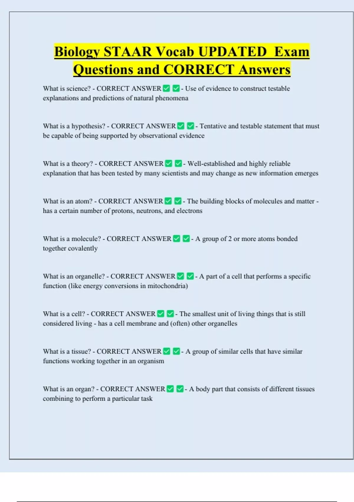 Biology STAAR Vocab UPDATED Exam Questions and CORRECT Answers What is science? - CORRECT ANSWER - Use of evidence to construct testable explanations and predictions of natural phenomena What is a hypothesis? - CORRECT ANSWER - Tentative and testable statement that must be capable of being supported by observational evidence What is a theory? - CORRECT ANSWER - Well-established and highly reliable explanation that has been tested by many scientists and may change as new information emerges What is an atom? - CORRECT ANSWER - The building blocks of molecules and matter - has a certain number of protons, neutrons, and electron