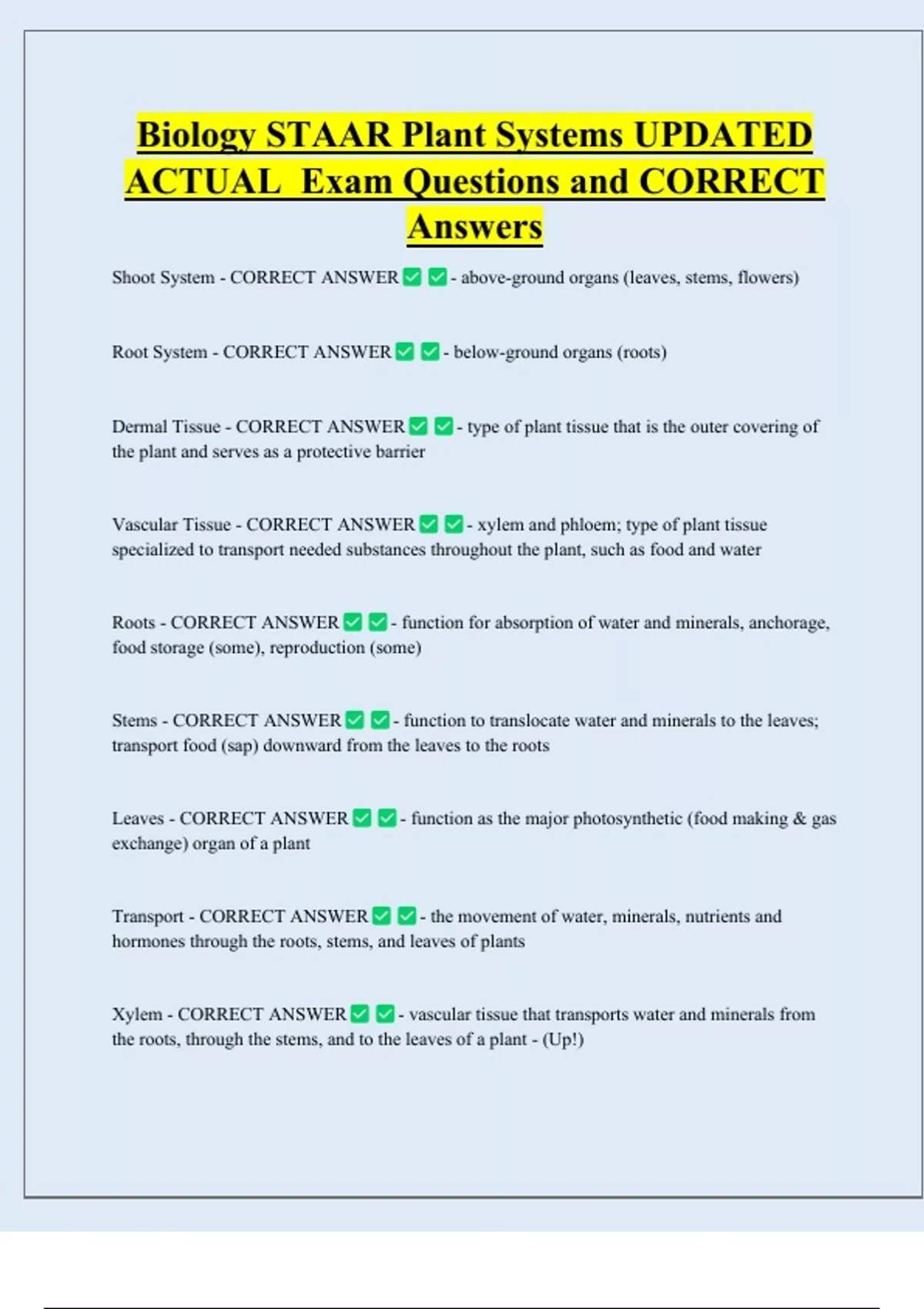Biology STAAR Plant Systems UPDATED ACTUAL Exam Questions and CORRECT Answers