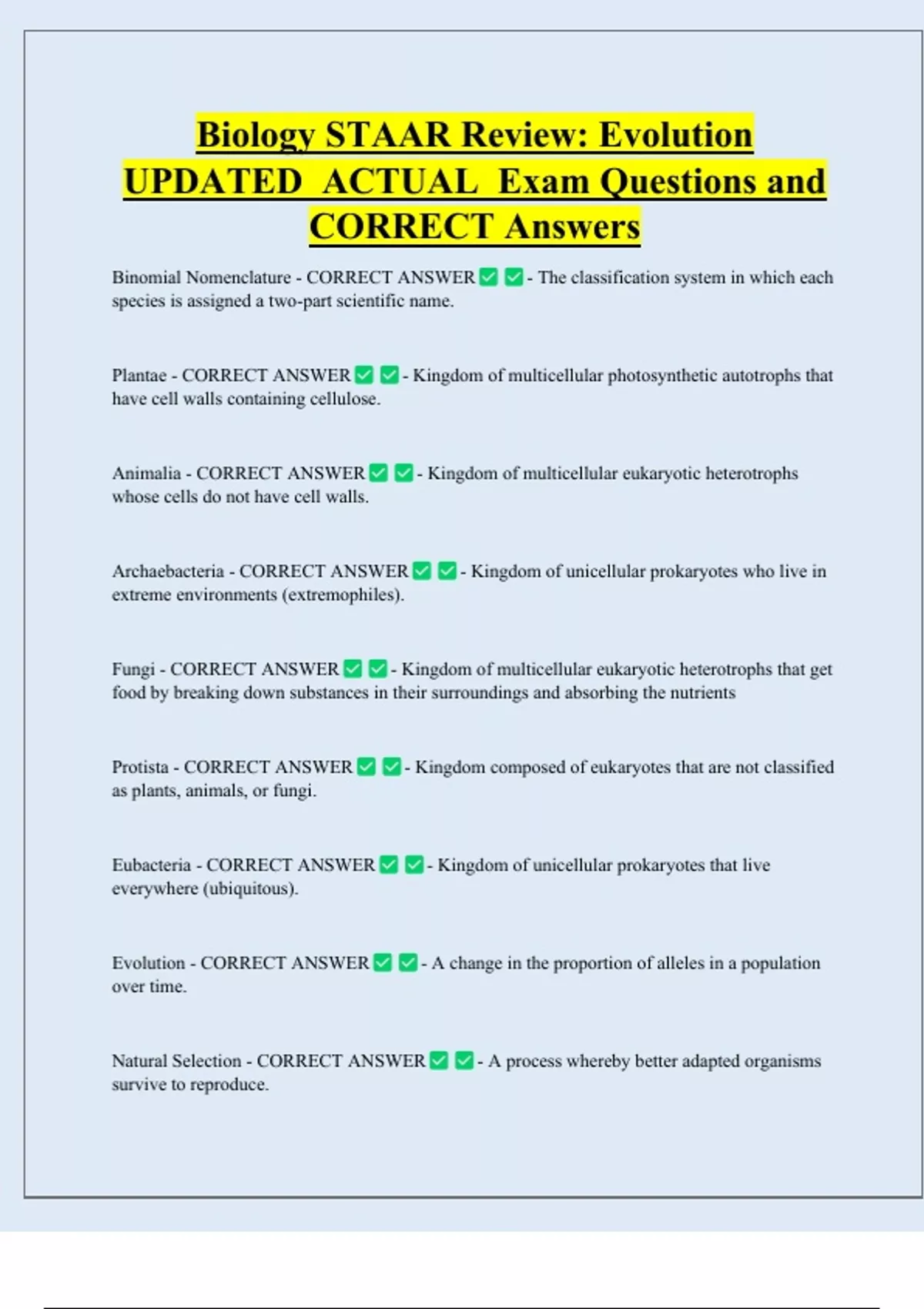 Biology STAAR Review: Evolution UPDATED ACTUAL Exam Questions and CORRECT Answers Binomial Nomenclature - CORRECT ANSWER species is assigned a two-part scientific name. Plantae - CORRECT ANSWER - The classification system in which each - Kingdom of multicellular photosynthetic autotrophs that have cell walls containing cellulose. Animalia - CORRECT ANSWER whose cells do not have cell walls. Archaebacteria - CORRECT ANSWER extreme environments (extremophiles). Fungi - CORRECT ANSWER - Kingdom of multicellular eukaryotic heterotrophs - Kingdom of unicellular prokaryotes who live in