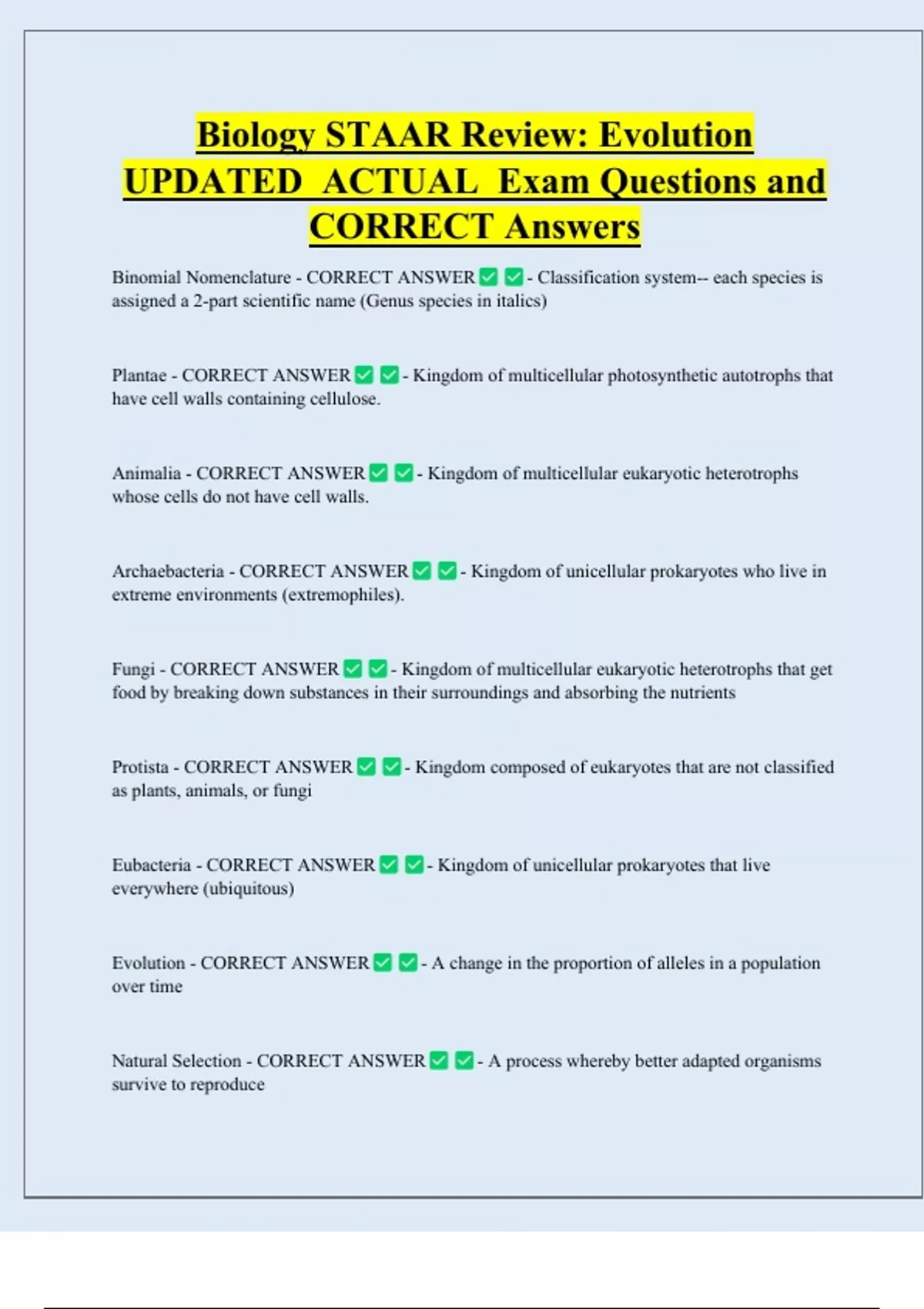 Biology STAAR Review: Evolution UPDATED ACTUAL Exam Questions and CORRECT Answers Binomial Nomenclature - CORRECT ANSWER - Classification system-- each species is assigned a 2-part scientific name (Genus species in italics) Plantae - CORRECT ANSWER have cell walls containing cellulose. Animalia - CORRECT ANSWER whose cells do not have cell walls. - Kingdom of multicellular photosynthetic autotrophs that - Kingdom of multicellular eukaryotic heterotrophs Archaebacteria - CORRECT ANSWER extreme environments (extremophiles). Fungi - CORRECT ANSWER - Kingdom of unicellular prokaryotes who live i