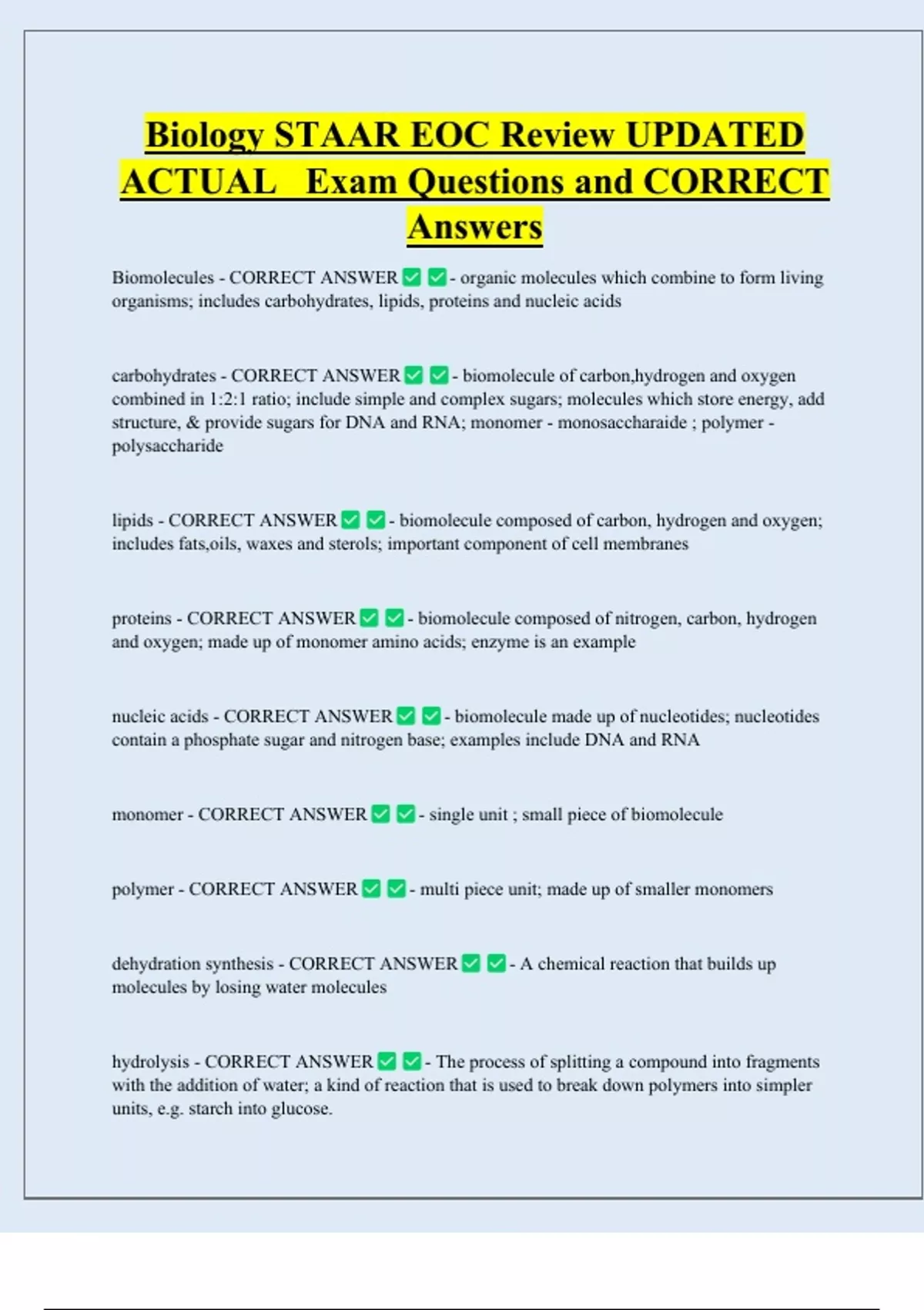 Biology STAAR EOC Review UPDATED ACTUAL Exam Questions and CORRECT Answers Biomolecules - CORRECT ANSWER - organic molecules which combine to form living organisms; includes carbohydrates, lipids, proteins and nucleic acids carbohydrates - CORRECT ANSWER - biomolecule of carbon,hydrogen and oxygen combined in 1:2:1 ratio; include simple and complex sugars; molecules which store energy, add structure, & provide sugars for DNA and RNA; monomer - monosaccharaide ; polymer - polysaccharide lipids - CORRECT ANSWER - biomolecule composed of carbon, hydrogen and oxygen; includes fats,oils, waxes and sterols; important component of cell membranes