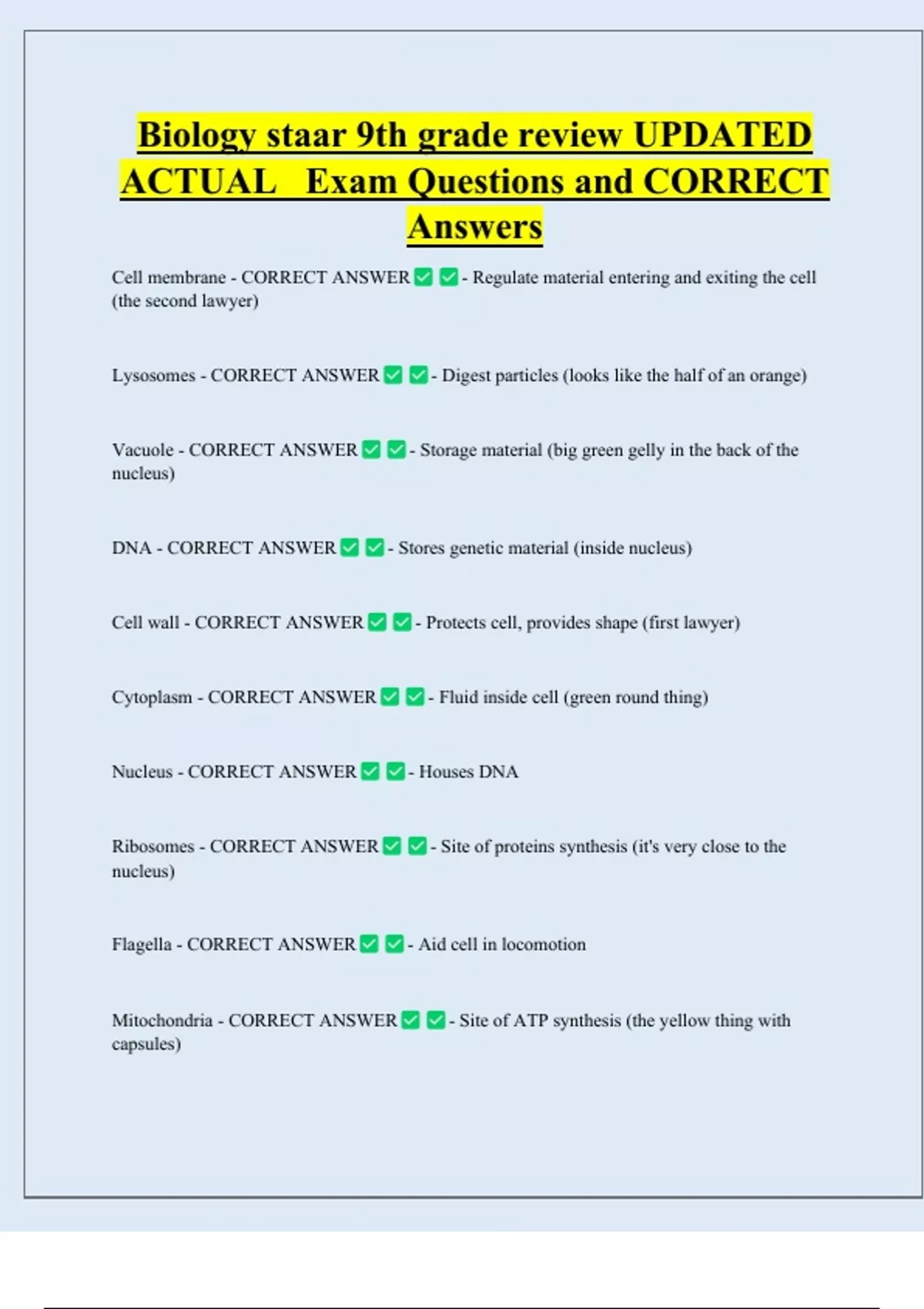 Cytoplasm - CORRECT ANSWER - Fluid inside cell (green round thing)