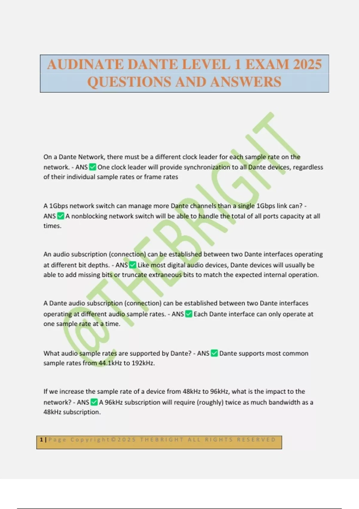 AUDINATE DANTE LEVEL 1 EXAM 2025 QUESTIONS AND ANSWERS On a Dante Network, there must be a different clock leader for each sample rate on the network. - ANS One clock leader will provide synchronization to all Dante devices, regardless of their individual sample rates or frame rates A 1Gbps network switch can manage more Dante channels than a single 1Gbps link can? - ANS A nonblocking network switch will be able to handle the total of all ports capacity at all times. An audio subscription (connection) can be established between two Dante interfaces operating at different bit depths. - ANS Like most digital audio devices, Dante devices will usually be able to add missing bits or truncate extraneous bits to match the expected internal operation. A Dante audio subscription (connection) can be established between two Dante interfaces operating at different audio sample rates. - ANS Each Dante interface can only operate at one sample rate at a time. What audio sample rates are supported by Dante? - ANS Dante supports most common sample rates from 44.1kHz to 192kHz. If we increase the sample rate of a device from 48kHz to 96kHz, what is the impact to the network? - ANS A 96kHz subscription will require (roughly) twice as much bandwidth as a 48kHz subscription. 2 | P a g e C o p y r i g h t © 2 0 2 5 T H E B R I G H T A L L R I G H T S R E S E R V E D The bit depth of an audio system dictates: - ANS the resolution of the audio signals amplitude. A greater bit depth increases dynamic range. The sample rate of an audio system dictates: - ANS the audii resolution in time. According to the Nyquist Theorem, the sample rate must be at least twice the highest audio frequency to be captured. Dante audio is sent: - ANS uncompressed, bit-perfect. Roughy how many channels of 24-bit,48kHz audio can be carried on a 1Gbps connection? - ANS 512x512 Dante AV devices send and receive uncompressed audio and is completely compatible with Dante audio devices - ANS Dante AV devices transport audio and video in separate essences so it is possible for a Dante AV device to send its audio channels to a Dante Audio device and vice-versa Dante AV is available in a variety of video codecs. What video codec is used by "Dante AV Ultra" that was discussed in this class? - ANS Compressed using a visually lossless JPEG2000 codec. Dante AV Ultra uses a JPEG2000 video codec and a 1Gbps connection. What is its maximum supported resolution(s) and frame rate(s)? Expressions here are shown in resolution, interlaced/progressive, framerate. For example, 1080p30 means 1920x1080, progressive, 30fps. - ANS Up to 4Kp60 Dante AV devices have a scaler in it. What does the scaler affect? - ANS The scaler can adapt screen resolution. (i.e. - it can scale a 4K source to 1080p for display) Which answer best describes the JPEG2000 encoding process? - ANS There is a "visually lossless" impact on the