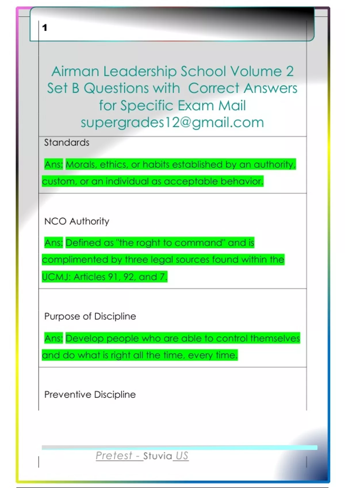 Airman Leadership School Volume 2 Set B Questions with Correct Answers for Specific Exam Mail supergrades12@gmail.com