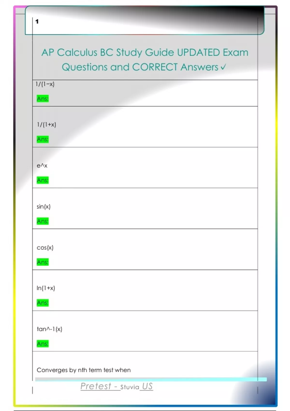 AP Calculus BC Study Guide UPDATED Exam Questions and CORRECT Answers