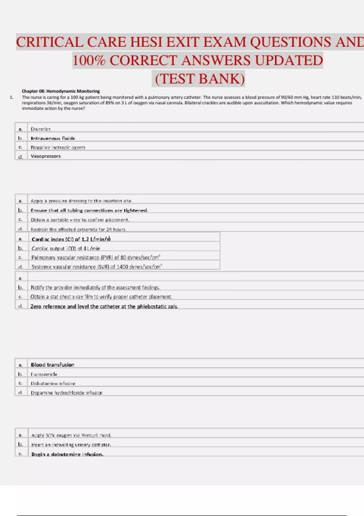 1. The nurse is caring for a 100-kg patient being monitored with a pulmonary artery catheter. The nurse assesses a blood pressure of 90/60 mm Hg, heart rate 110 beats/min,