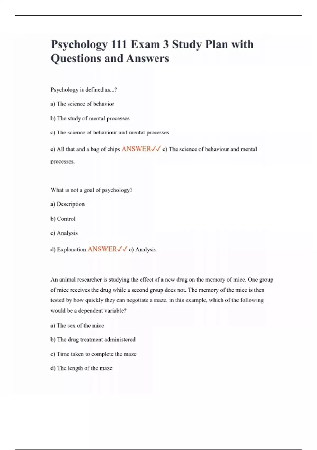 Psychology 111 Exam 3 Study Plan with Questions and Answers Psychology is defined as...? a) The science of behavior b) The study of mental processes c) The science of behaviour and mental processes e) All that and a bag of chips ANSWER c) The science of behaviour and mental processes. What is not a goal of psychology? a) Description b) Control c) Analysis d) Explanation ANSWER c) Analysis. An animal researcher is studying the effect of a new drug on the memory of mice. One group of mice receives the drug while a second group does not. The memory of the mice is then tested by how quickly they can negotiate a maze. in this example, which of the following would be a dependent variable? a) The sex of the mice b) The drug treatment administered c) Time taken to complete the maze d) The length of the maze