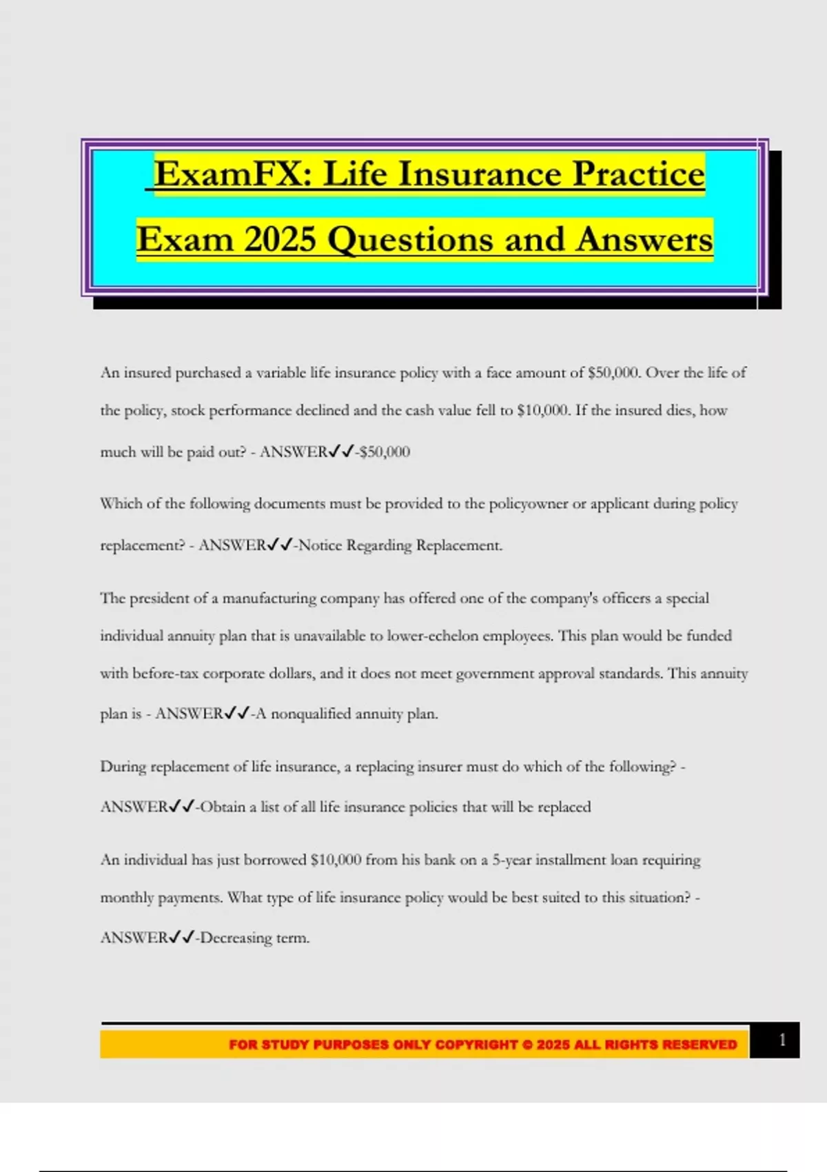 FOR STUDY PURPOSES ONLY COPYRIGHT © 2025 ALL RIGHTS RESERVED 1