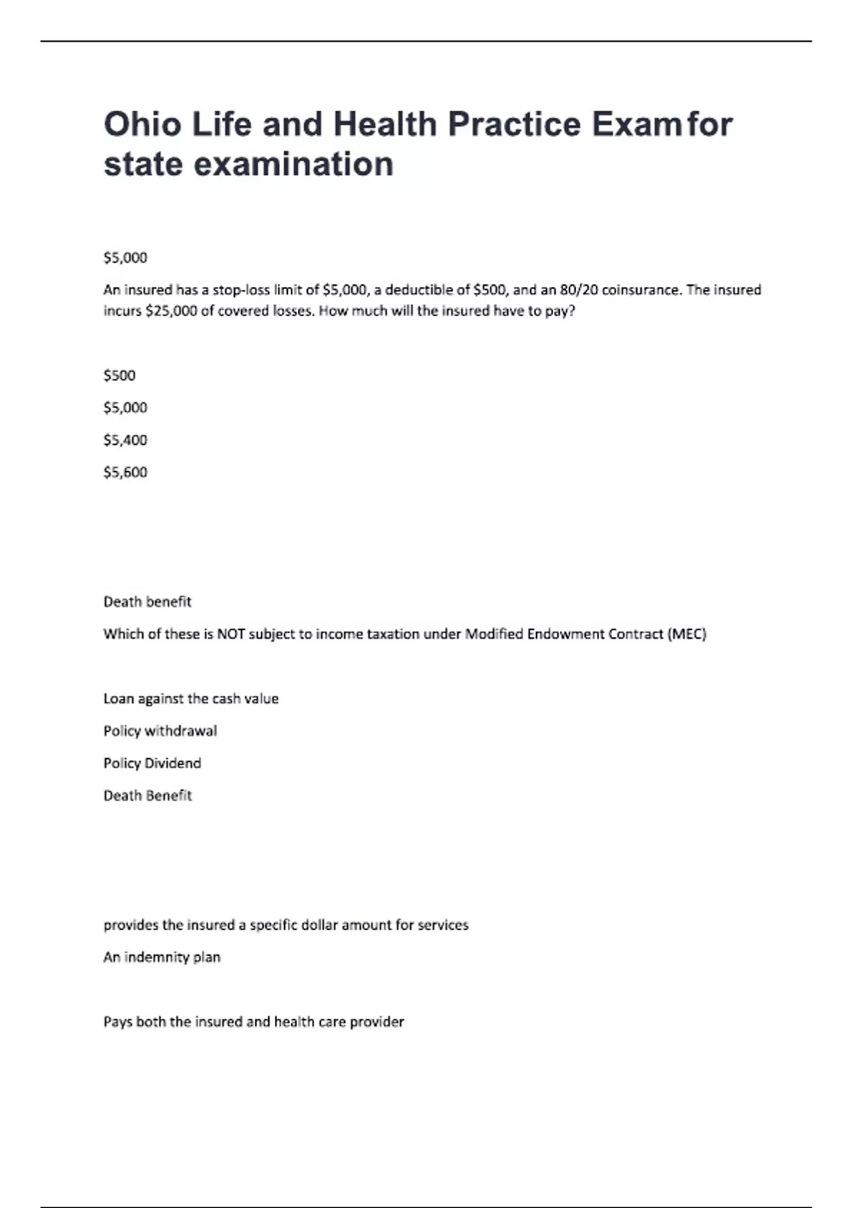 Ohio Life and Health Practice Exam for state examination QUESTIONS WITH VERIFIED ANSWERS (100% CORRECT) GRADED A+!!!!! $5,000 An insured has a stop-loss limit of $5,000, a deductible of $500, and an 80/20 coinsurance. The insured incurs $25,000 of covered losses. How much will the insured have to pay? $500 $5,000 $5,400 $5,600 Death benefit Which of these is NOT subject to income taxation under Modified Endowment Contract (MEC) Loan against the cash value Policy withdrawal Policy Dividend Death Benefit provides the insured a specific dollar amount for services An indemnity plan Pays both the insured and health care provider