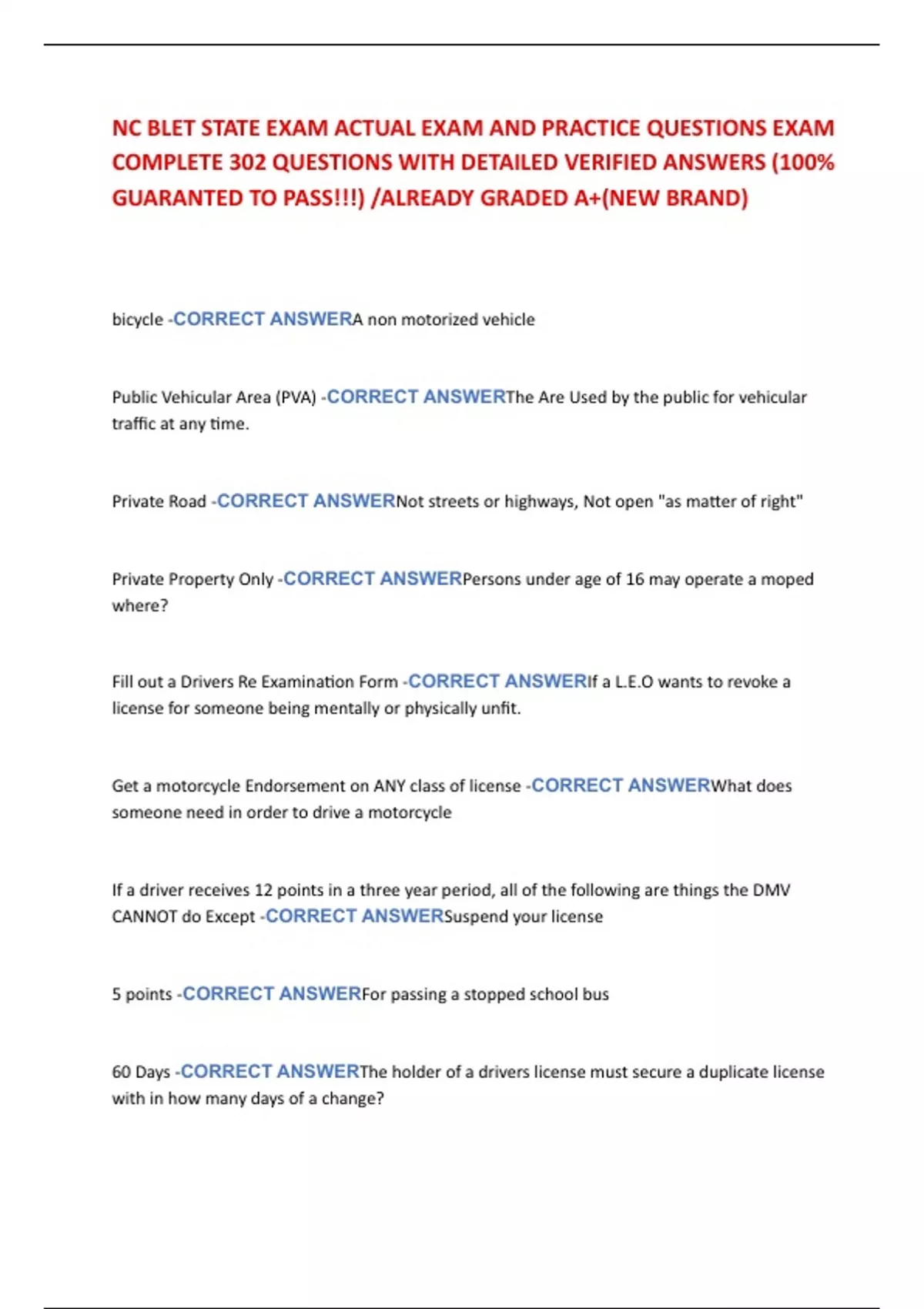 NC BLET STATE EXAM ACTUAL EXAM AND PRACTICE QUESTIONS EXAM