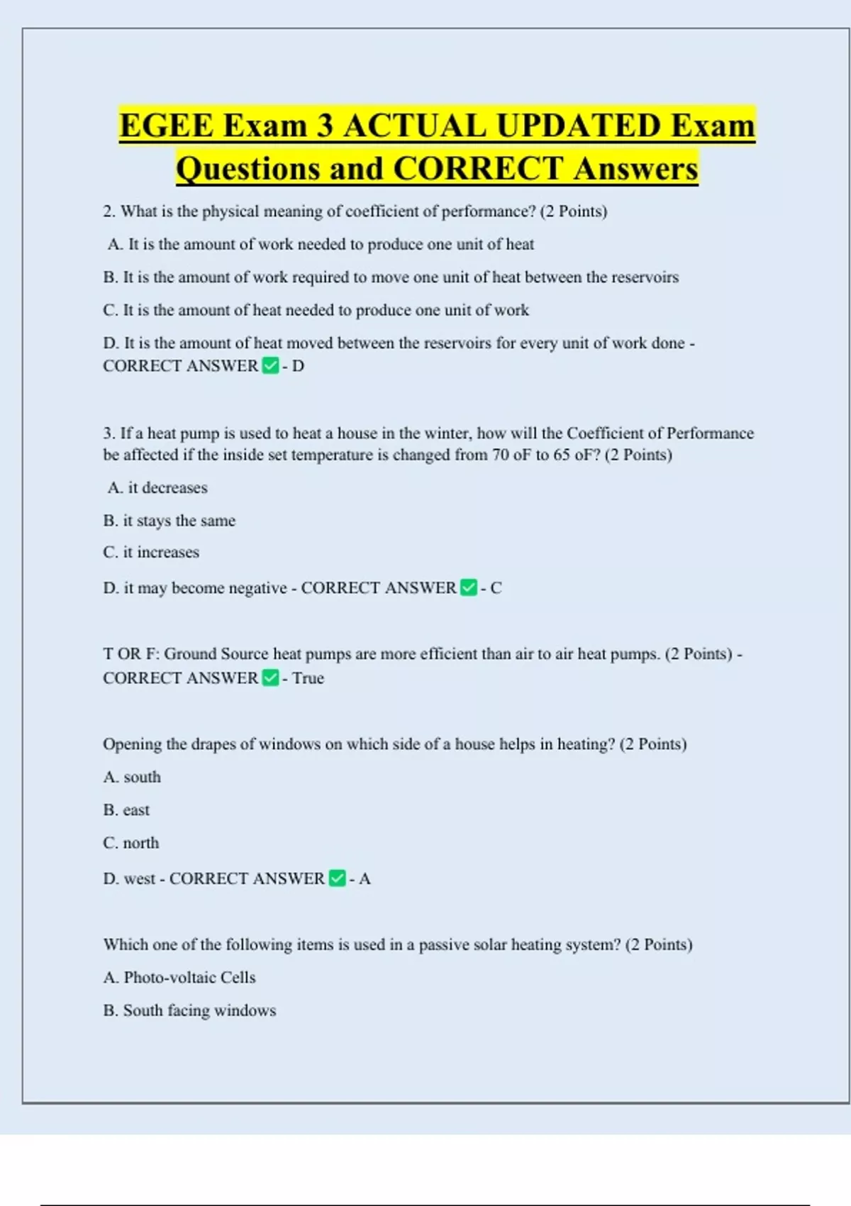 EGEE Exam 3 ACTUAL UPDATED Exam Questions and CORRECT Answers 2. What is the physical meaning of coefficient of performance? (2 Points) A. It is the amount of work needed to produce one unit of heat B. It is the amount of work required to move one unit of heat between the reservoirs C. It is the amount of heat needed to produce one unit of work D. It is the amount of heat moved between the reservoirs for every unit of work done - CORRECT ANSWER - D 3. If a heat pump is used to heat a house in the winter, how will the Coefficient of Performance be affected if the inside set temperature is changed from 70 oF to 65 oF? (2 Points