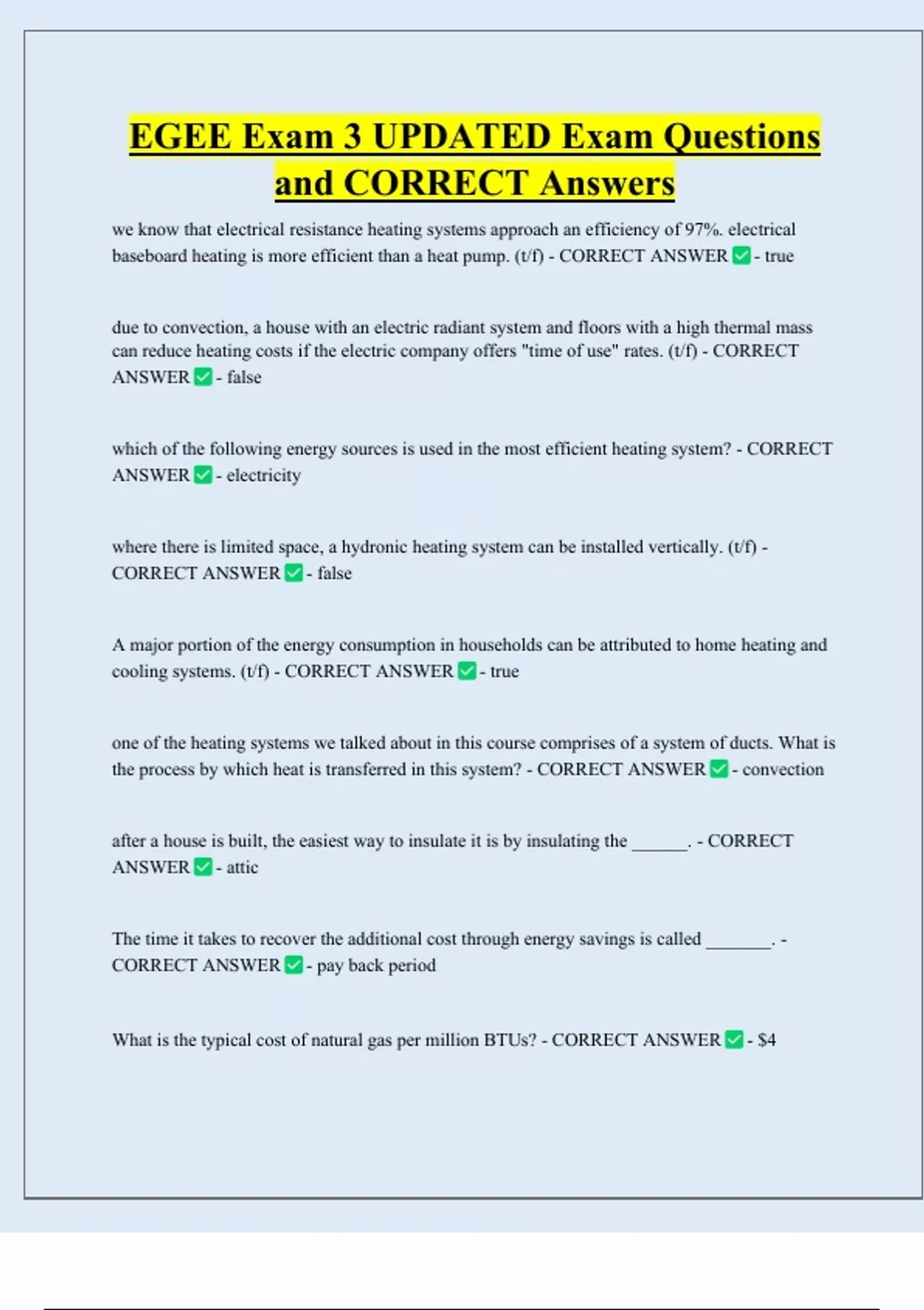 EGEE Exam 3 UPDATED Exam Questions and CORRECT Answers we know that electrical resistance heating systems approach an efficiency of 97%. electrical baseboard heating is more efficient than a heat pump. (t/f) - CORRECT ANSWER - true due to convection, a house with an electric radiant system and floors with a high thermal mass can reduce heating costs if the electric company offers "time of use" rates. (t/f) - CORRECT ANSWER - false which of the following energy sources is used in the most efficient heating system? - CORRECT ANSWER - electricity where there is limited space, a hydronic heating system can be installed vertically. (t