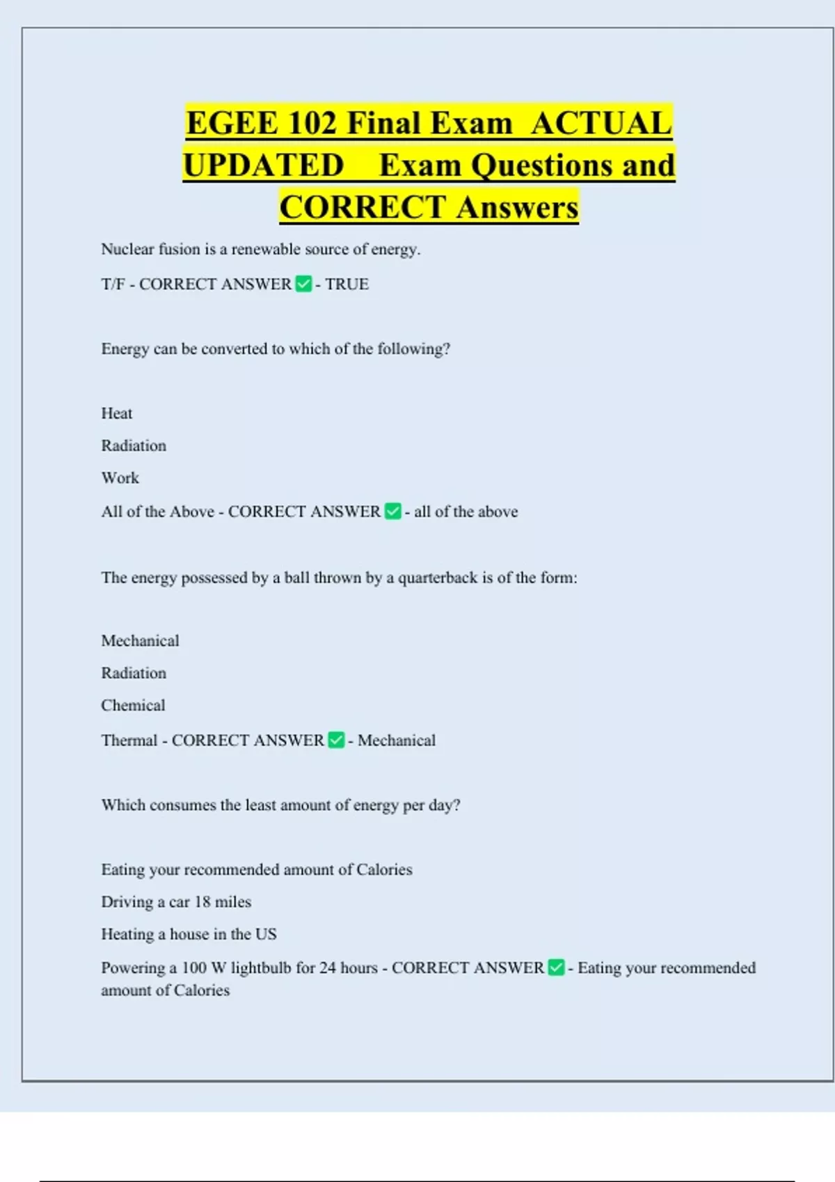 EGEE 102 Final Exam ACTUAL UPDATED Exam Questions and CORRECT Answers Nuclear fusion is a renewable source of energy. T/F - CORRECT ANSWER - TRUE Energy can be converted to which of the following? Heat Radiation Work All of the Above - CORRECT ANSWER - all of the above