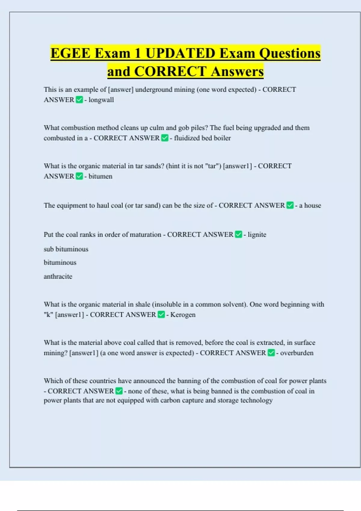 EGEE Exam 1 UPDATED Exam Questions and CORRECT Answers This is an example of [answer] underground mining (one word expected) - CORRECT ANSWER - longwall What combustion method cleans up culm and gob piles? The fuel being upgraded and them combusted in a - CORRECT ANSWER - fluidized bed boiler What is the organic material in tar sands? (hint it is not "tar") [answer1] - CORRECT