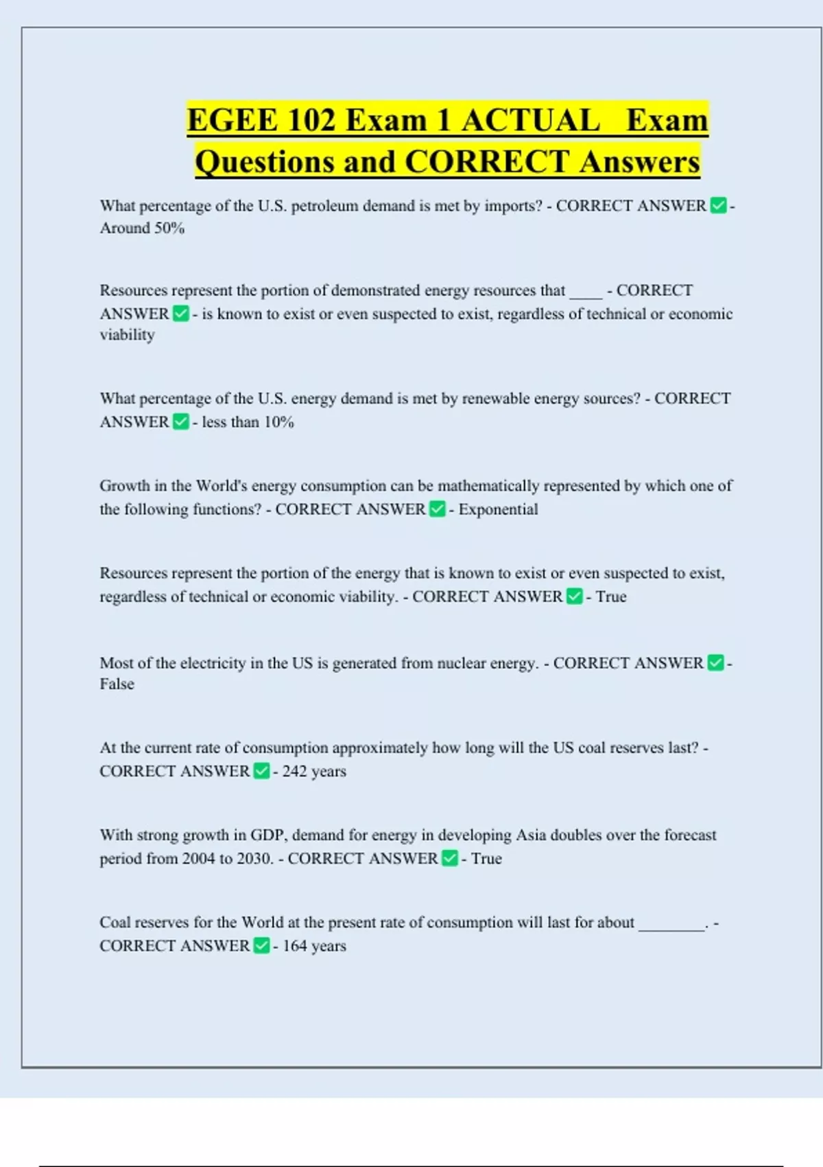 EGEE 102 Exam 1 ACTUAL Exam Questions and CORRECT Answers What percentage of the U.S. petroleum demand is met by imports? - CORRECT ANSWER - Around 50% Resources represent the portion of demonstrated energy resources that ____ - CORRECT ANSWER - is known to exist or even suspected to exist, regardless of technical or economic viability What percentage of the U.S. energy demand is met by renewable energy sources? - CORRECT ANSWER - less than 10% Growth in the World's energy consumption can be mathematically represented by which one of the following functions? - CORRECT ANSWER - Exponential