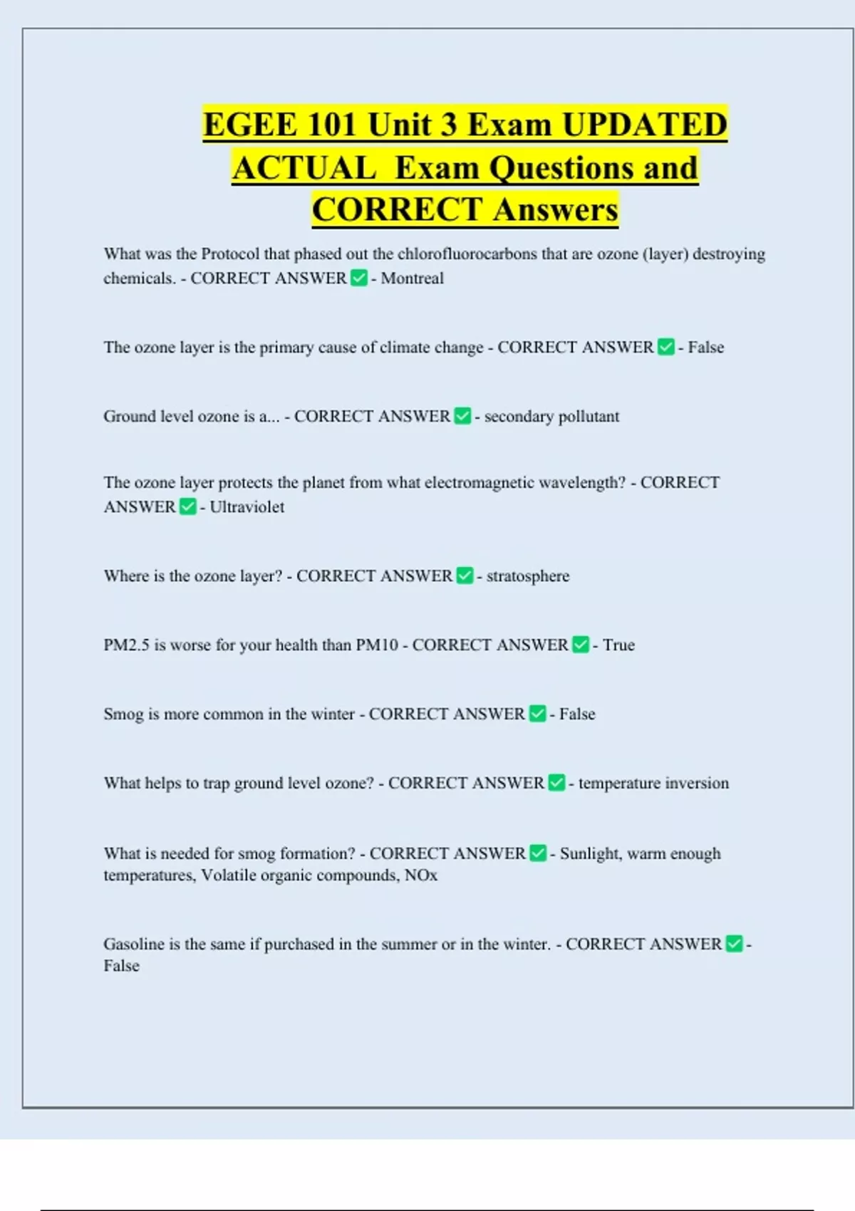 EGEE 101 Unit 3 Exam UPDATED ACTUAL Exam Questions and CORRECT Answers What was the Protocol that phased out the chlorofluorocarbons that are ozone (layer) destroying chemicals. - CORRECT ANSWER - Montreal The ozone layer is the primary cause of climate change - CORRECT ANSWER - False Ground level ozone is a... - CORRECT ANSWER - secondary pollutant The ozone layer protects the planet from what electromagnetic wavelength? - CORRECT ANSWER - Ultraviole