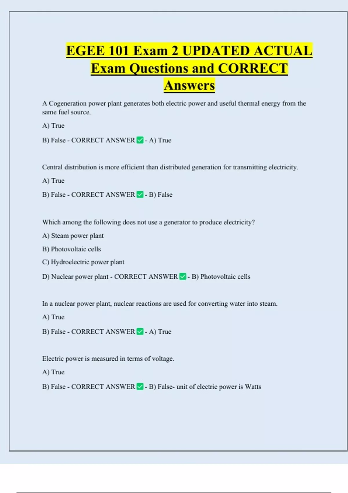 D) Nuclear power plant - CORRECT ANSWER - B) Photovoltaic cells