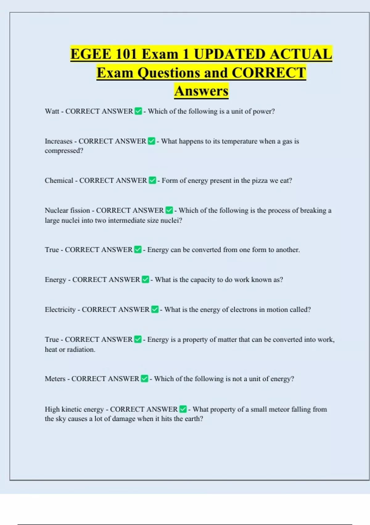 EGEE 101 Exam 1 UPDATED ACTUAL Exam Questions and CORRECT Answers Watt - CORRECT ANSWER - Which of the following is a unit of power? Increases - CORRECT ANSWER - What happens to its temperature when a gas is compressed? Chemical - CORRECT ANSWER - Form of energy present in the pizza we eat? Nuclear fission - CORRECT ANSWER - Which of the following is the process of breaking a large nuclei into two intermediate size nuclei?
