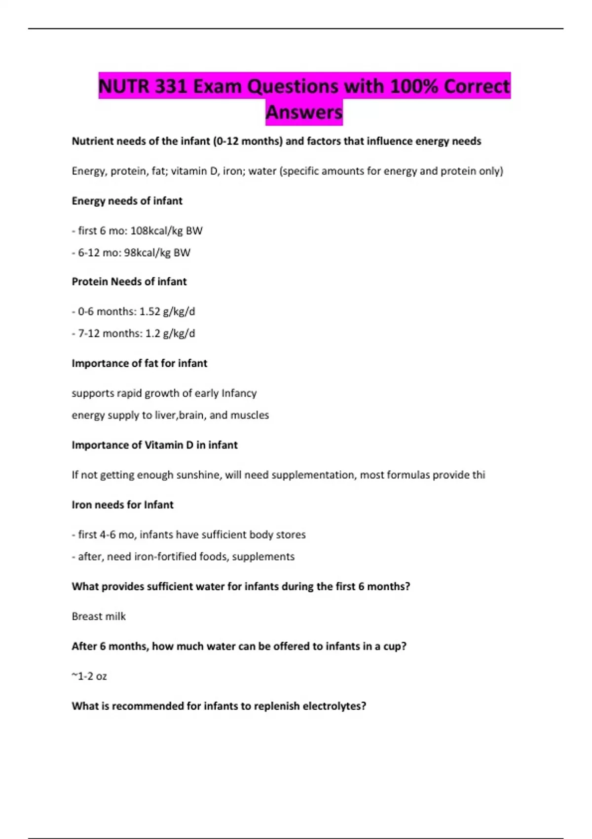 NUTR 331 Exam Questions with 100% Correct