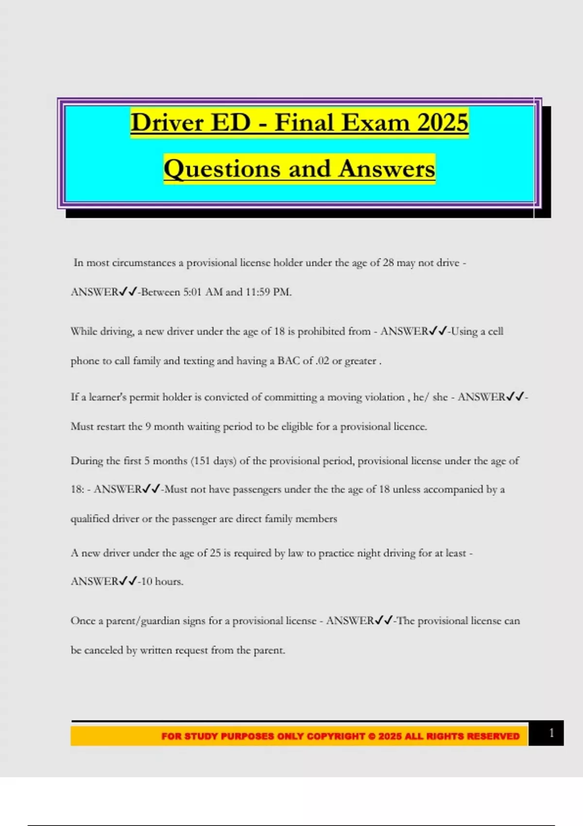 FOR STUDY PURPOSES ONLY COPYRIGHT © 2025 ALL RIGHTS RESERVED 1
